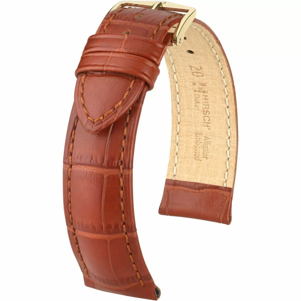 Unikalny jasnobrązowy pasek skórzany z lini Hirsch Alligator embossed wykonany najlepszej  włoskiej skóry cielęcej . Z naturalnie wyglądającą półbłyszczącą w dwóch tonach powierzchnią ze specjalnym przetłoczeniem oddającym rzeczywistą strukturę skóry Aligatora z Luisiany w prostokąne łuski. Rozmiar 20 mm, klamerka w kolorze złotym, ceniona austriacka marka Hirsch. DUKE jako model  należy do rodziny produktów Exotic embossed leather. Niesamowity kształt, luksusowy wyraz, piękny pasek skórzany wykonany ręcznie do eleganckich zegarków. Pasek z pierwszorzędnej,miękkiej i wygodnej włoskiej skóry cielęcej rewelacyjnie sprawdzi się jako dodatek do zegarka na codzień. Dla trwałości i wzmocnienia pasek został przeszyty nicią w kolorze paska, nadając mu tym samym unikatowego charakteru i żywotności.