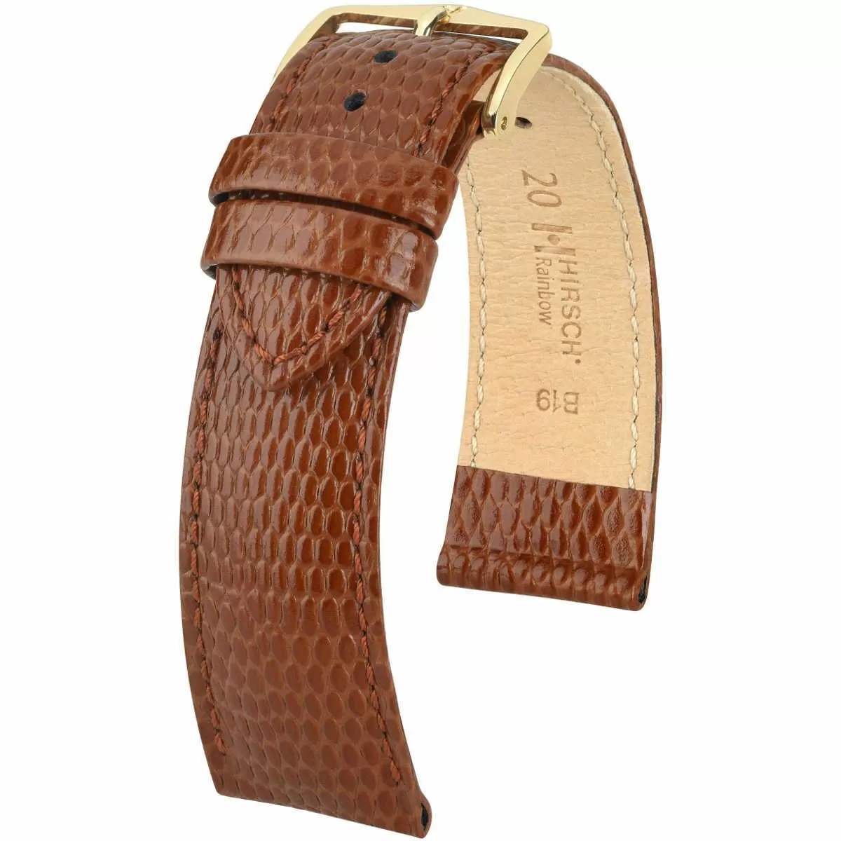Klasyczny jasnobrązowy pasek skórzany z lini HIRSCH Exotic embossed leather to ponadczasowo elegancki pasek któryjest świetnym akcesorium do klasycznych zegarków. Wykonany ręcznie z najlepszej skóry cielęcej  z jedwabistym połyskiem i naturalnie wyglądającymi tłoczeniami łuski jaszczurki w półmatowym dwutonowym wykończeniu. Rozmiar 20 mm, klamerka w kolorze złotym, ceniona austriacka marka Hirsch. Rainbow jako model należy do lini Hirsch softglove lining leatherDelikatne przeszycia w kolorze paska podkreślają elegancki charakter i dodają trwałości.