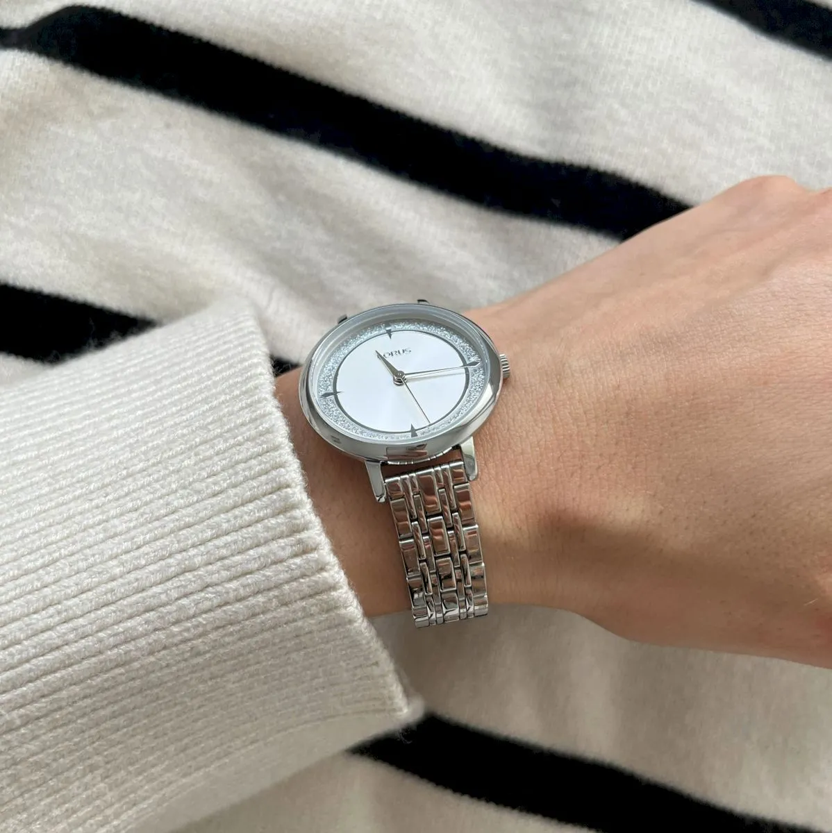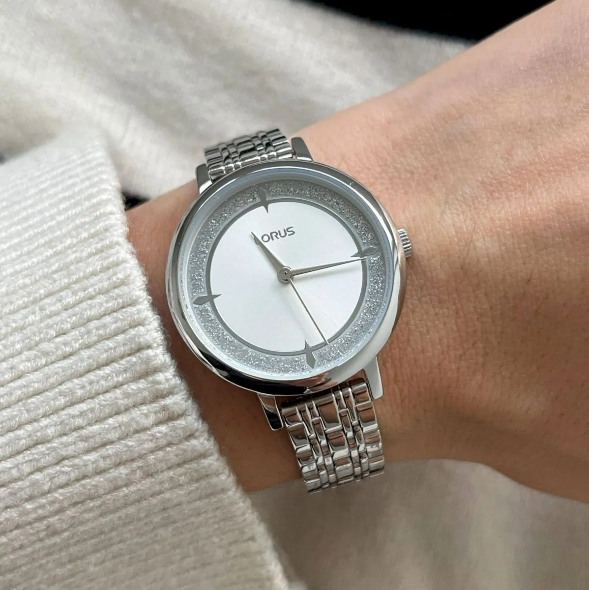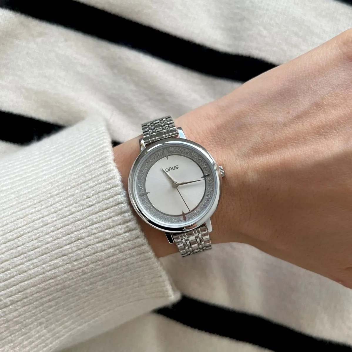 Zegarek damski Lorus RG291NX9 to stylowy model działający na mechanizmie kwarcowym, zasilanym przez baterię, który charakteryzuje się niskim odchyleniem w pomiarze czasu (zaledwie +/- 10 sekund w skali miesiąca). Został on ukryty pod elegancką srebrną tarczą, na której umieszczony został brokat, który dodaje uroku i wdzięku zegarkowi. Całość chroni odporne na delikatne przerysowania szkiełko mineralne. Obudowa została zaprojektowana tak, aby zapewnić 5ATM wodoszczelności. Rewelacyjnie prezentuje się połączenie srebrnej koperty z wymiarową, srebrną bransoletką.
