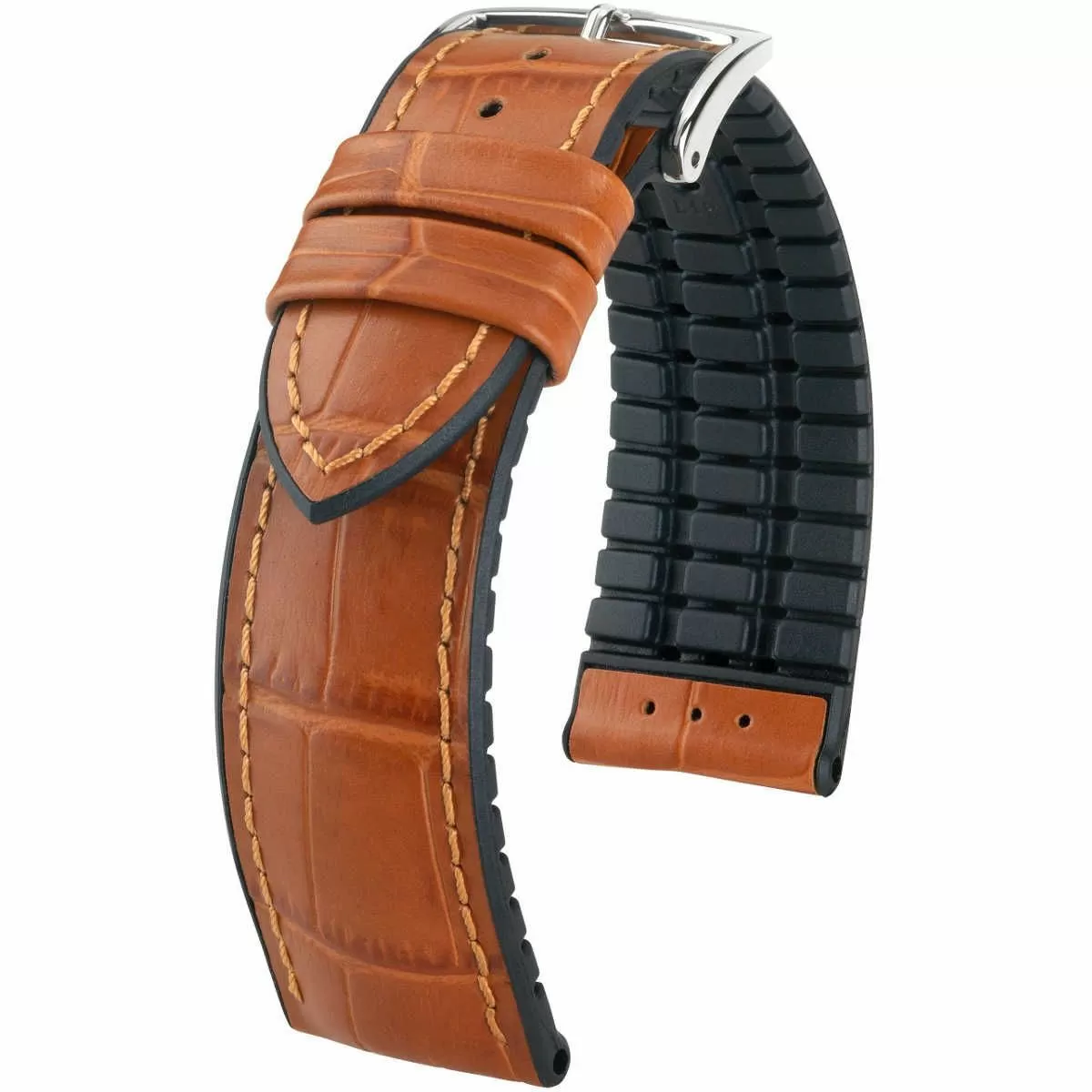 Sportowo klasyczny miodowobrązowo-czarny pasek skórzany z lini HIRSCH Performance to pasek który jest nadal świeży; ponadczasowy, z klasą, niezawodny dla dzisiejszego mężczyzny ceniącego klasykę. Wykonany ręcznie z najlepszej włoskiej skóry cielęcej z zaawansowaną odporną na zarysowania powierzchnią z naturalnie wyglądającymi tłoczeniami łuski aligatora w półmatowym dwutonowym wykończeniu która obleczona jest na rdzeniu z wysokogatunkowego kauczuku uformowanego w taki sposób aby umożliwiał wentylację. Rozmiar 22 mm, klamerka w kolorze srebrnym, ceniona austriacka marka Hirsch. Paul jako model należy do lini Hirsch Alligator embossed jest też wodoszczelny i testowany w saunie. Przeszycia w kolorze paska dodają mu uniwersalnego charakteru i trwałości.