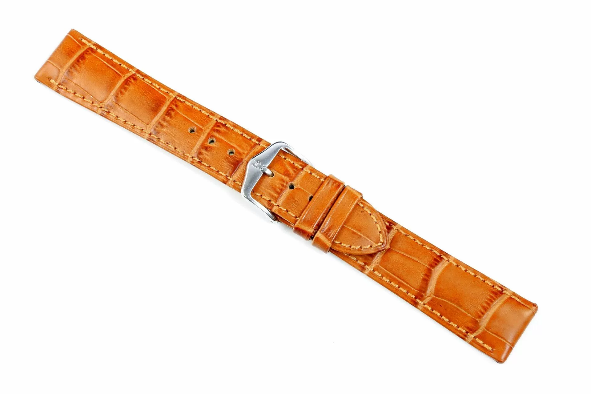 Unikalny miodowobrązowy pasek skórzany z lini Hirsch Alligator embossed wykonany najlepszej  włoskiej skóry cielęcej . Z naturalnie wyglądającą półbłyszczącą w dwóch tonach powierzchnią ze specjalnym przetłoczeniem oddającym rzeczywistą strukturę skóry Aligatora z Luisiany w prostokąne łuski. Rozmiar 16 mm, klamerka w kolorze złotym, ceniona austriacka marka Hirsch. DUKE jako model  należy do rodziny produktów Exotic embossed leather. Niesamowity kształt, luksusowy wyraz, piękny pasek skórzany wykonany ręcznie do eleganckich zegarków. Pasek z pierwszorzędnej,miękkiej i wygodnej włoskiej skóry cielęcej rewelacyjnie sprawdzi się jako dodatek do zegarka na codzień. Dla trwałości i wzmocnienia pasek został przeszyty nicią w kolorze paska, nadając mu tym samym unikatowego charakteru i żywotności.