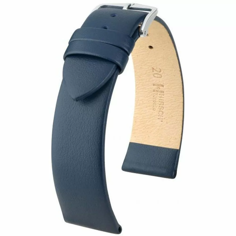 Nowy elegancki płaski niebieski pasek skórzany z lini HIRSCH Softglove lining leather "twardy na zewnątrz, miękki w środku" to motto tego dyskretnie eleganckiego paska Wykonany ręcznie  z drobnoziarnistej włoskie skóry cielęcej. Rozmiar 18 mm, klamerka w kolorze srebrnym , ceniona austriacka marka Hirsch. Toronto jako model należy do rodziny produktów Untruktured leather . Brak przeszycia dodaje mu eleganckiego charakteru i delikatności tak ważnej dla właścicieli klasycznych zegarków.
