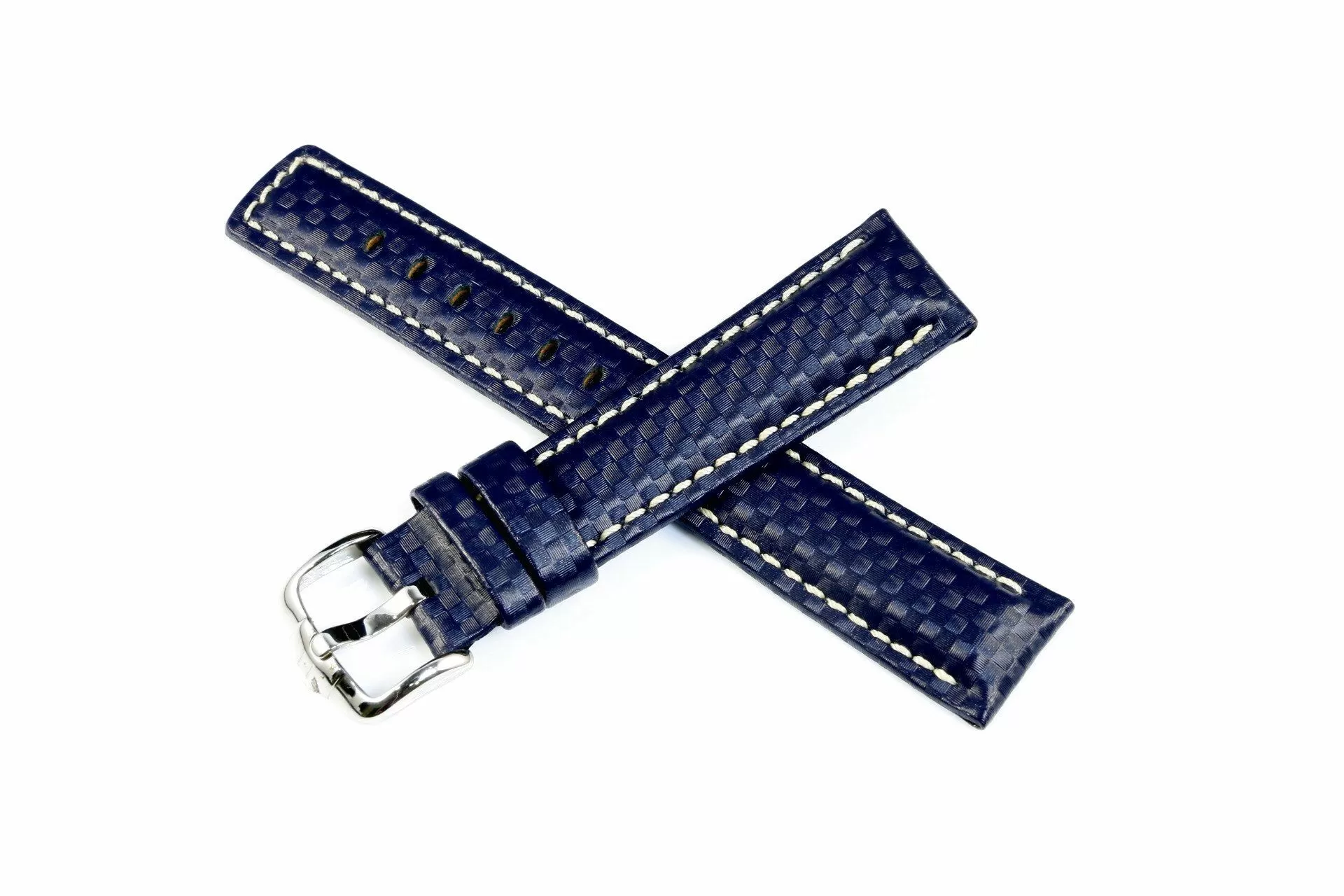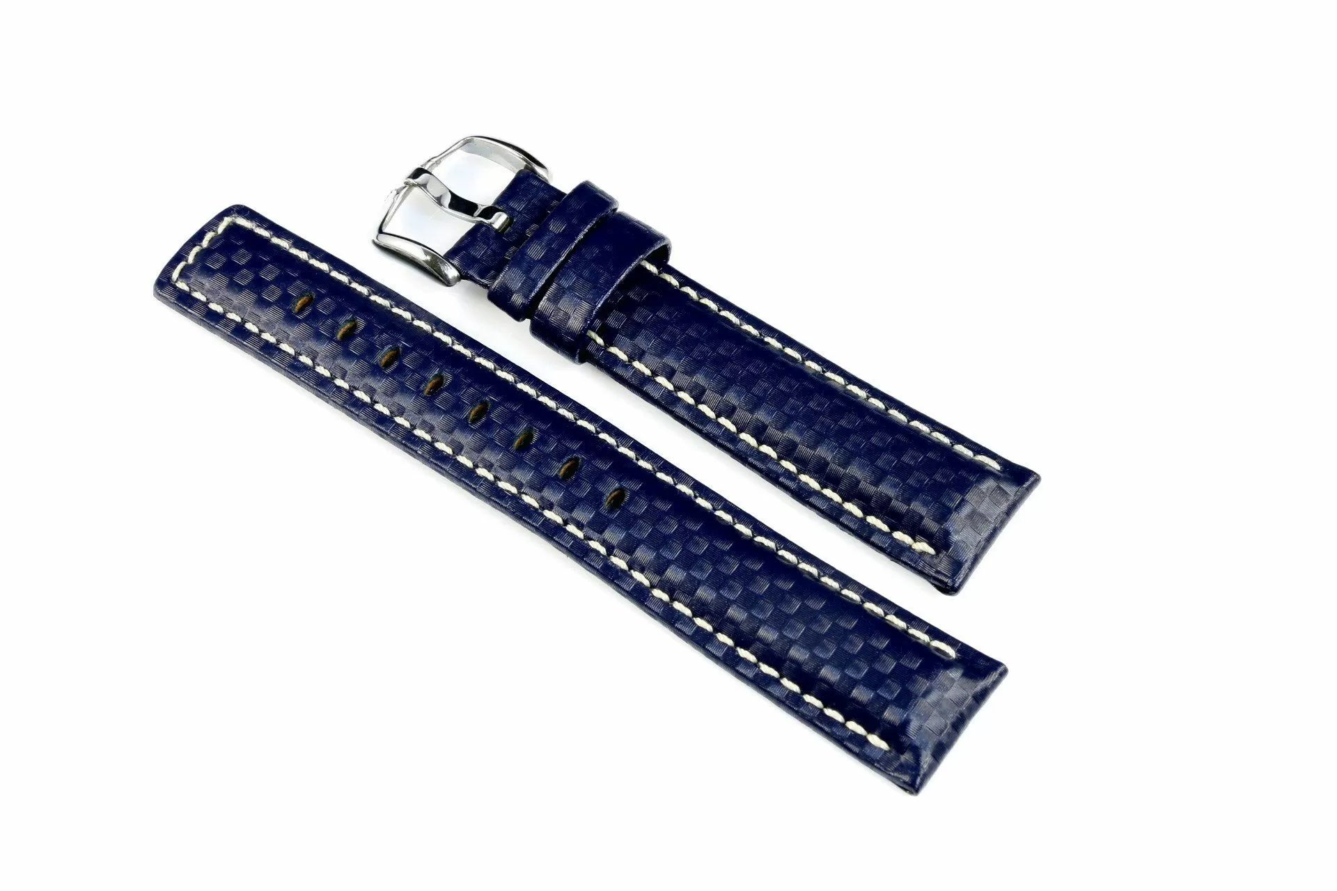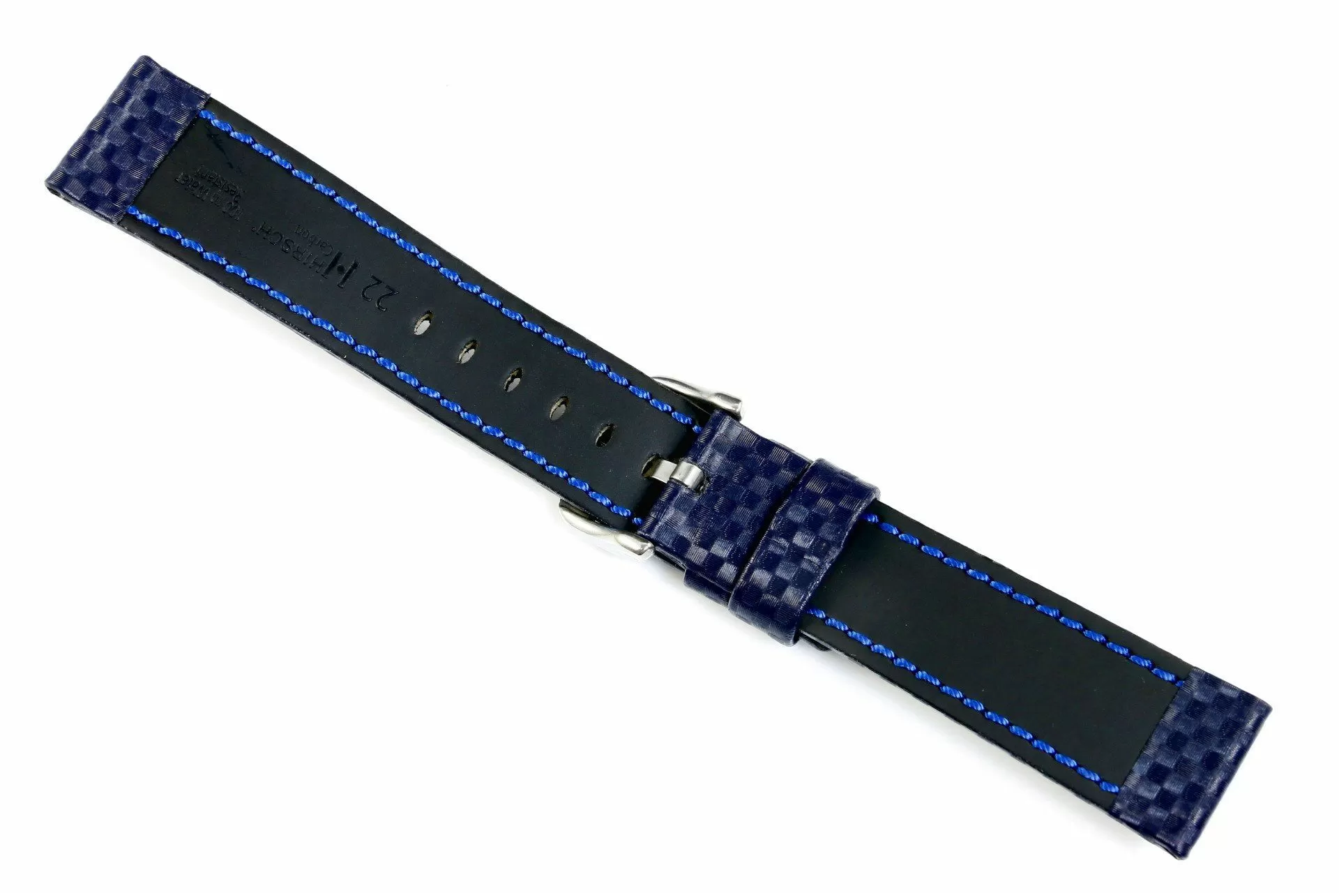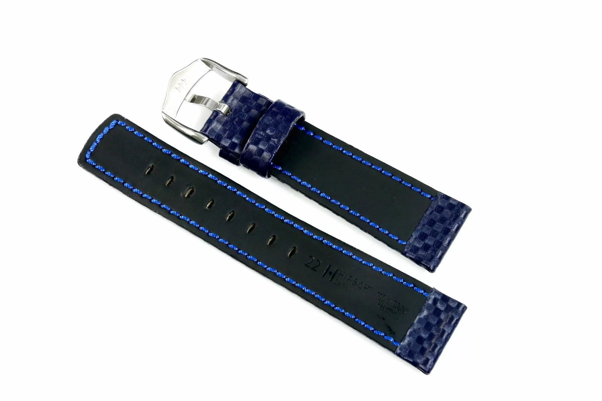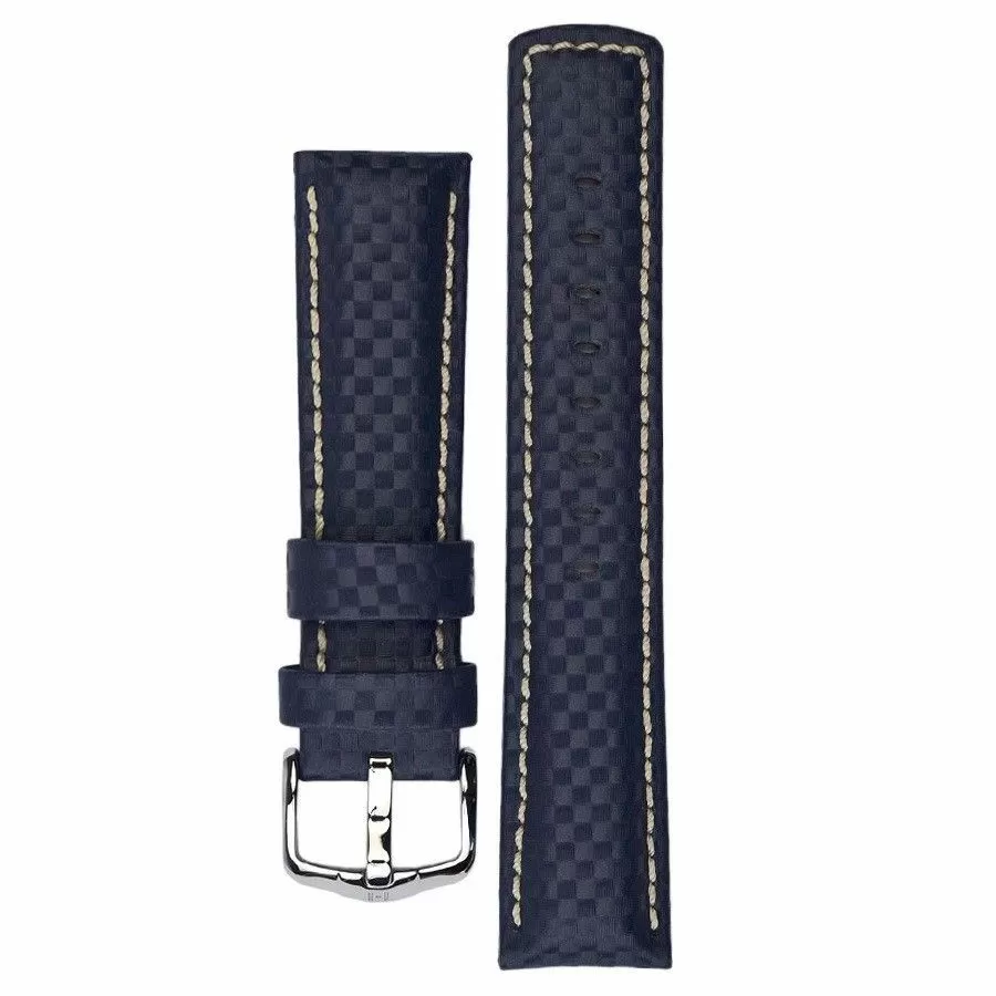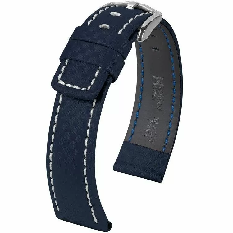 Hi-Tech niebieski pasek skórzany z lini HIRSCH Rubberlike lining leather jest pierwszy w swojej lidze gdzie funkcja i projekt są ze sobą spójne. Wykonany ręcznie z mocnej i odpornej skóry Hi-Tech o fakturze powierzchni ze szczegółową strukturą włókien węglowych. Rozmiar 18 mm, klamerka w kolorze srebrnym , ceniona austriacka marka Hirsch. Carbon jako model należy do rodziny produktów Struktured leather i posiada funkcjonalość Hirsch 100 m Water-Resistant co umożliwia montaż paska do wodoszczelnych zegarków z ktorymi można pływać a nawet nurkować. Przeszyty nicią w kontrastowym kolorze dla podkreślenia silnego nowoczesnego charakteru.