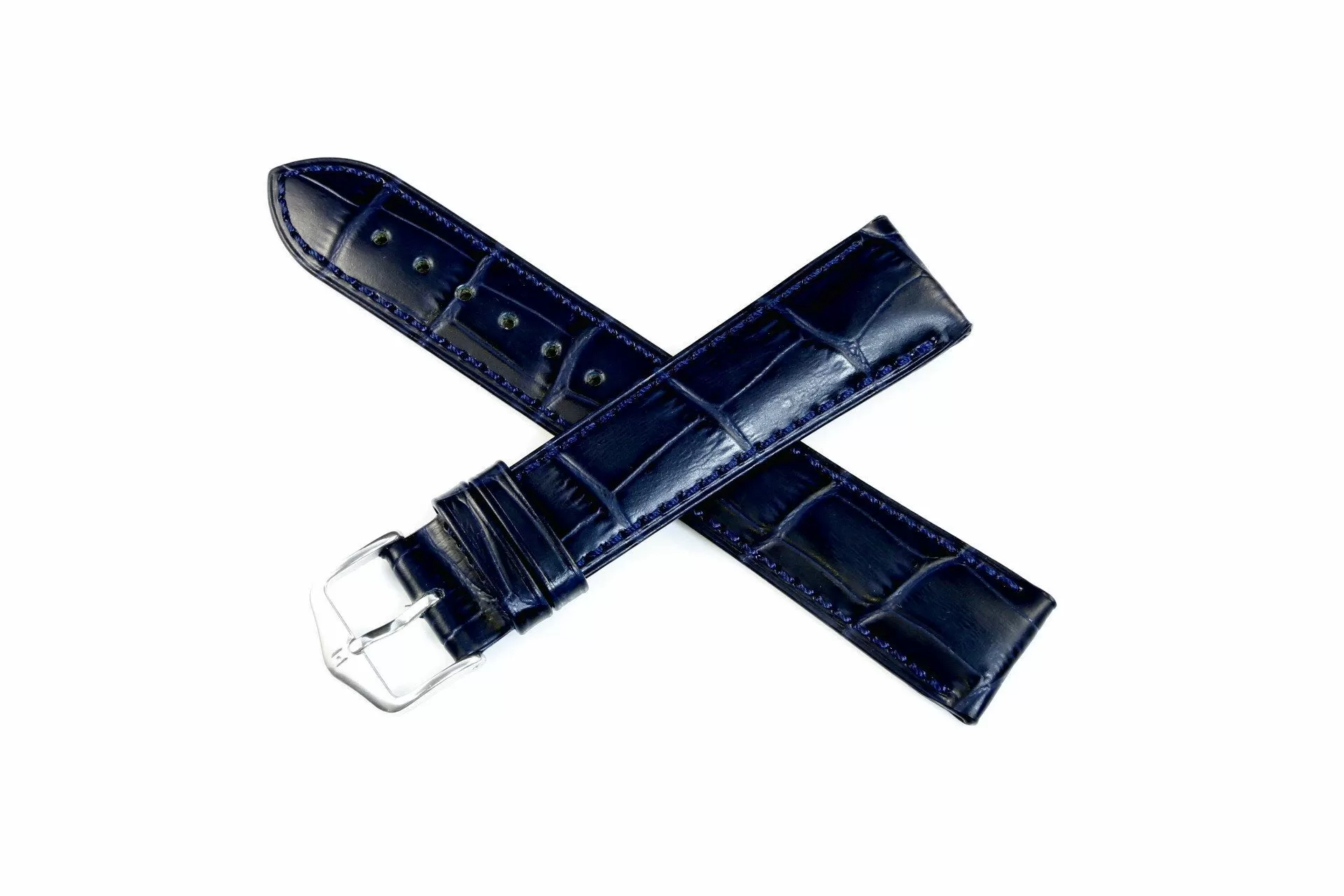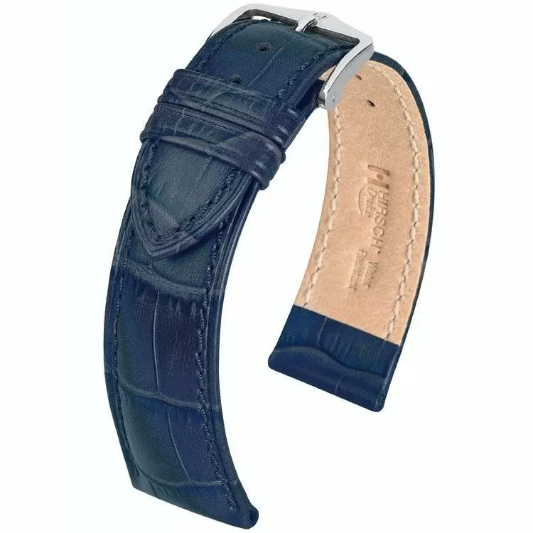 Unikalny niebieski pasek skórzany z lini Hirsch Alligator embossed wykonany najlepszej  włoskiej skóry cielęcej . Z naturalnie wyglądającą półbłyszczącą w dwóch tonach powierzchnią ze specjalnym przetłoczeniem oddającym rzeczywistą strukturę skóry Aligatora z Luisiany w prostokąne łuski. Rozmiar 20 mm, klamerka w kolorze srebrnym, ceniona austriacka marka Hirsch. DUKE jako model  należy do rodziny produktów Exotic embossed leather. Niesamowity kształt, luksusowy wyraz, piękny pasek skórzany wykonany ręcznie do eleganckich zegarków. Pasek z pierwszorzędnej,miękkiej i wygodnej włoskiej skóry cielęcej rewelacyjnie sprawdzi się jako dodatek do zegarka na codzień. Dla trwałości i wzmocnienia pasek został przeszyty nicią w kolorze paska, nadając mu tym samym unikatowego charakteru i żywotności.