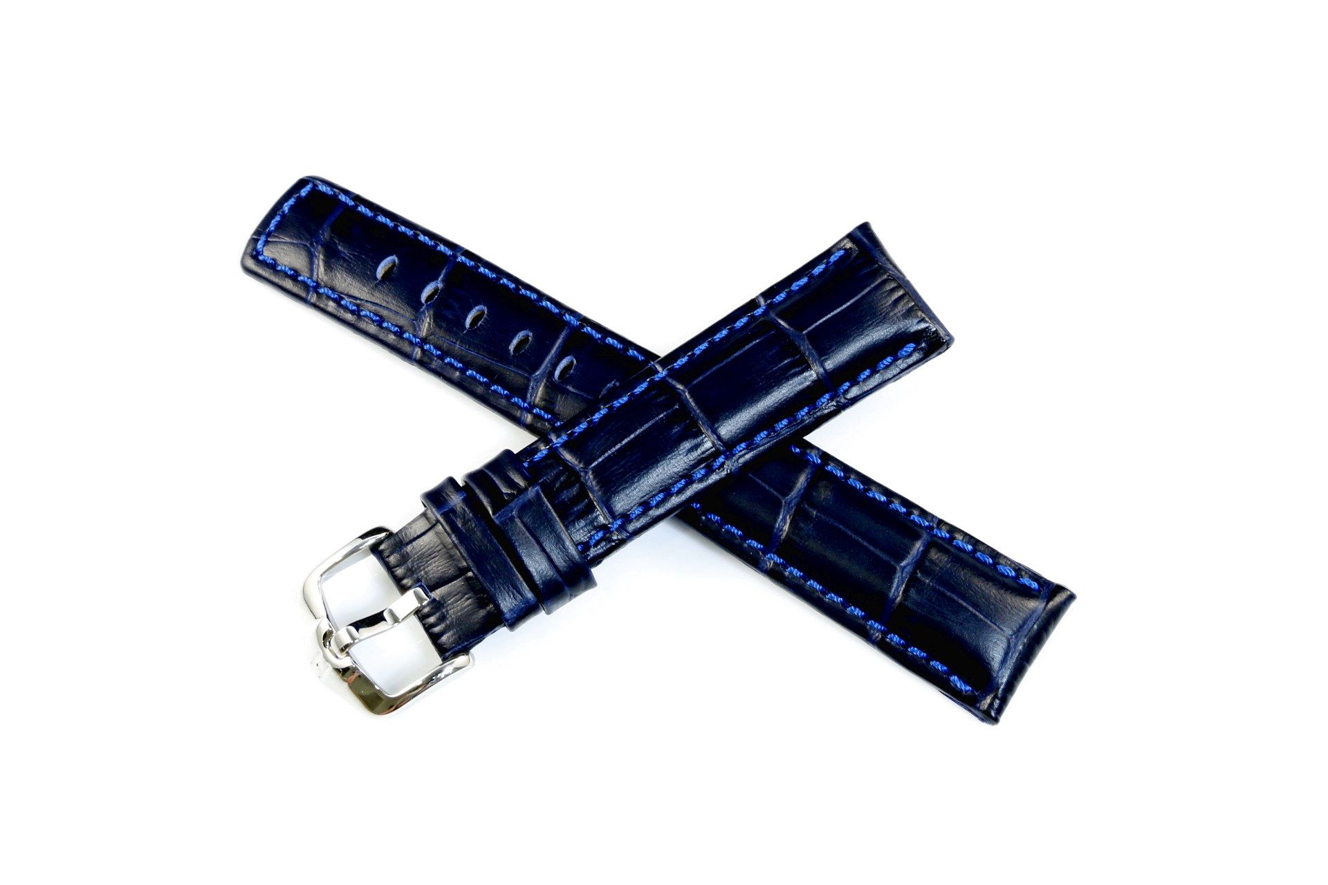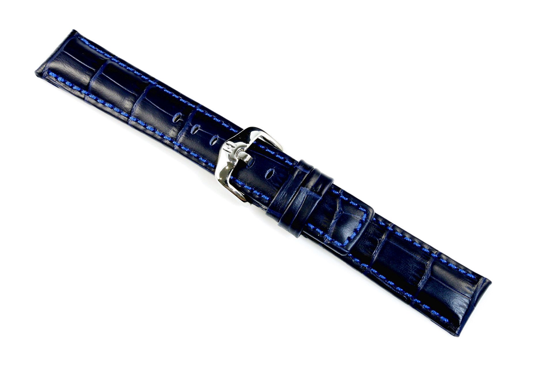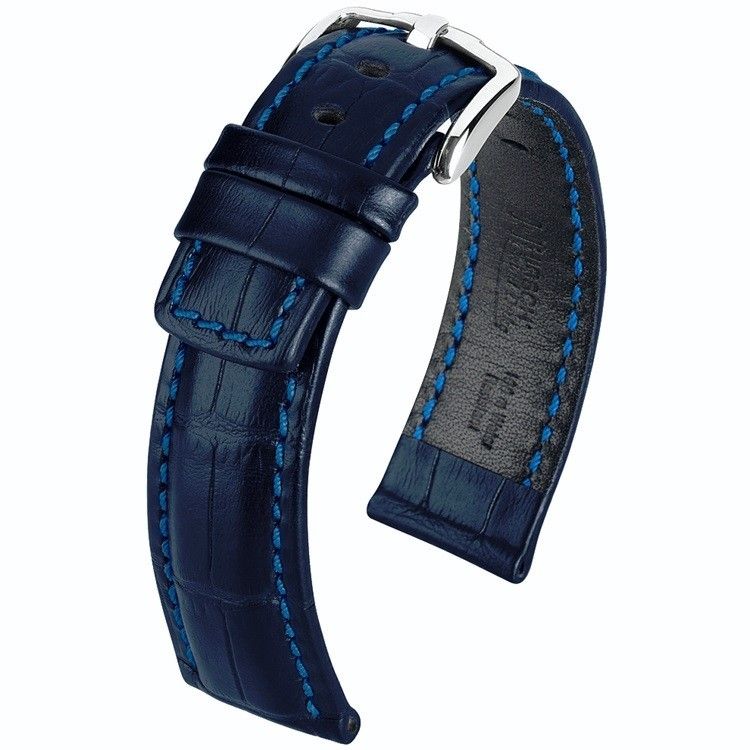 Mocny i dynamiczny niebieski pasek skórzany z lini HIRSCH Diving Glove lining leather emanuje sportowym charakterem i wykonany jest z najlepszej włoskiej  skóry cielęcej . Naturalnie wyglądającej półbłyszczącej w dwóch tonach powierzchni ze specjalnym przetłoczeniem oddającym rzeczywistą strukturę skóry Aligatora z Luisiany w prostokąne łuski ,wykonany ręcznie. Rozmiar 22 mm, klamerka w kolorze srebrnym , ceniona austriacka marka Hirsch. Grand Duke jako model  należy do rodziny produktów Exotic embosed leather i Hirsch 100 m Water-Resistant co umożliwia montaż do wodoszczelnych zegarków z ktorymi można pływać a nawet nurkować. Przeszyty nicią w kolorze paska lub kontrastowym dla podkreślenia silnego charakteru.