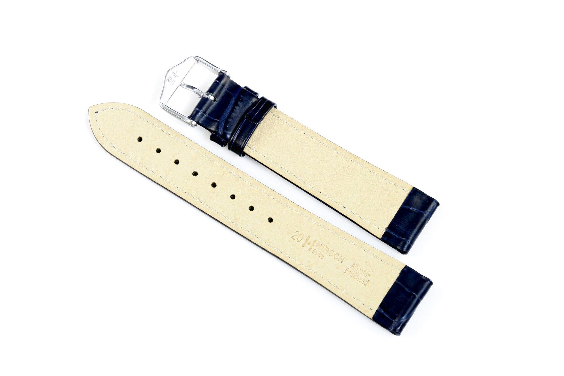 Unikalny niebieski pasek skórzany z lini Hirsch Alligator embossed wykonany najlepszej  włoskiej skóry cielęcej . Z naturalnie wyglądającą półbłyszczącą w dwóch tonach powierzchnią ze specjalnym przetłoczeniem oddającym rzeczywistą strukturę skóry Aligatora z Luisiany w prostokąne łuski. Rozmiar 24 mm, klamerka w kolorze srebrnym, ceniona austriacka marka Hirsch. DUKE jako model  należy do rodziny produktów Exotic embossed leather. Niesamowity kształt, luksusowy wyraz, piękny pasek skórzany wykonany ręcznie do eleganckich zegarków. Pasek z pierwszorzędnej,miękkiej i wygodnej włoskiej skóry cielęcej rewelacyjnie sprawdzi się jako dodatek do zegarka na codzień. Dla trwałości i wzmocnienia pasek został przeszyty nicią w kolorze paska, nadając mu tym samym unikatowego charakteru i żywotności.