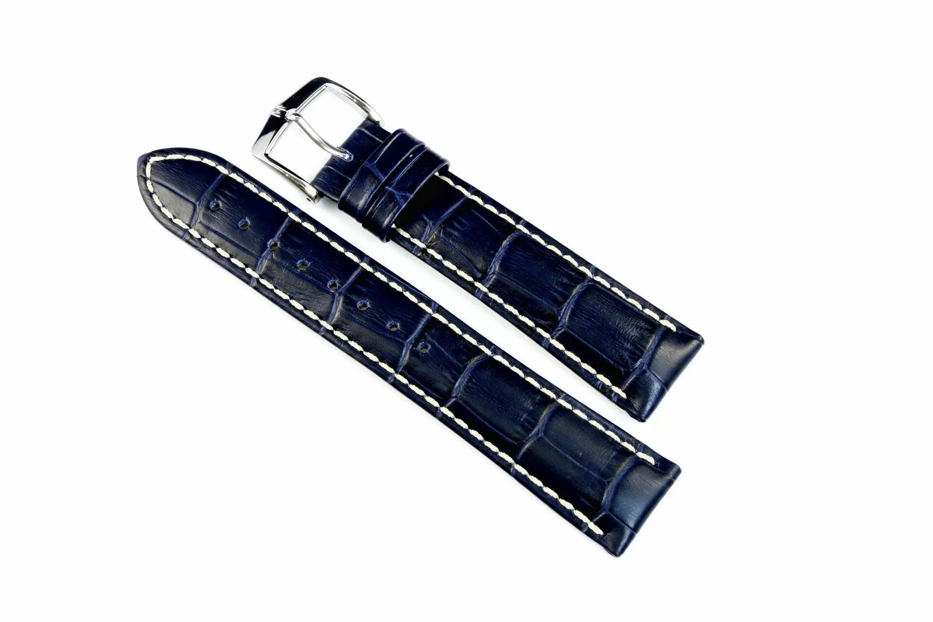 Klasyczny niebieski pasek skórzany z lini HIRSCH Exotic embossed leather to pasek który ma klasyczny charakter ze sportową nutą co czyni go bardzo popularnym akcesorium. Wykonany ręcznie z najlepszej włoskiej skóry cielęcej  z naturalnie wyglądającymi tłoczeniami łuski aligatora w półmatowym dwutonowym wykończeniu. Rozmiar 24 mm, klamerka w kolorze srebrnym, ceniona austriacka marka Hirsch. Modena jako model należy do lini Hirsch softglove lining leatherGrube przeszycia w białym kolorze  podkreślają wyraźny charakter i  dodają trwałości.