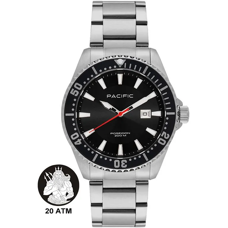 Zegarek Pacific Poseidon SMPB-2001 wyróżnia się imponującą wodoszczelnością 20 ATM (200 metrów), co czyni go idealnym wyborem nie tylko dla pływaków, ale także dla miłośników nurkowania.