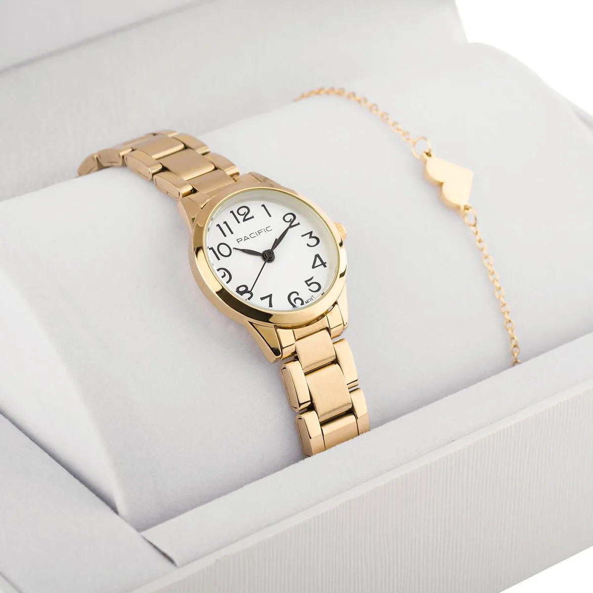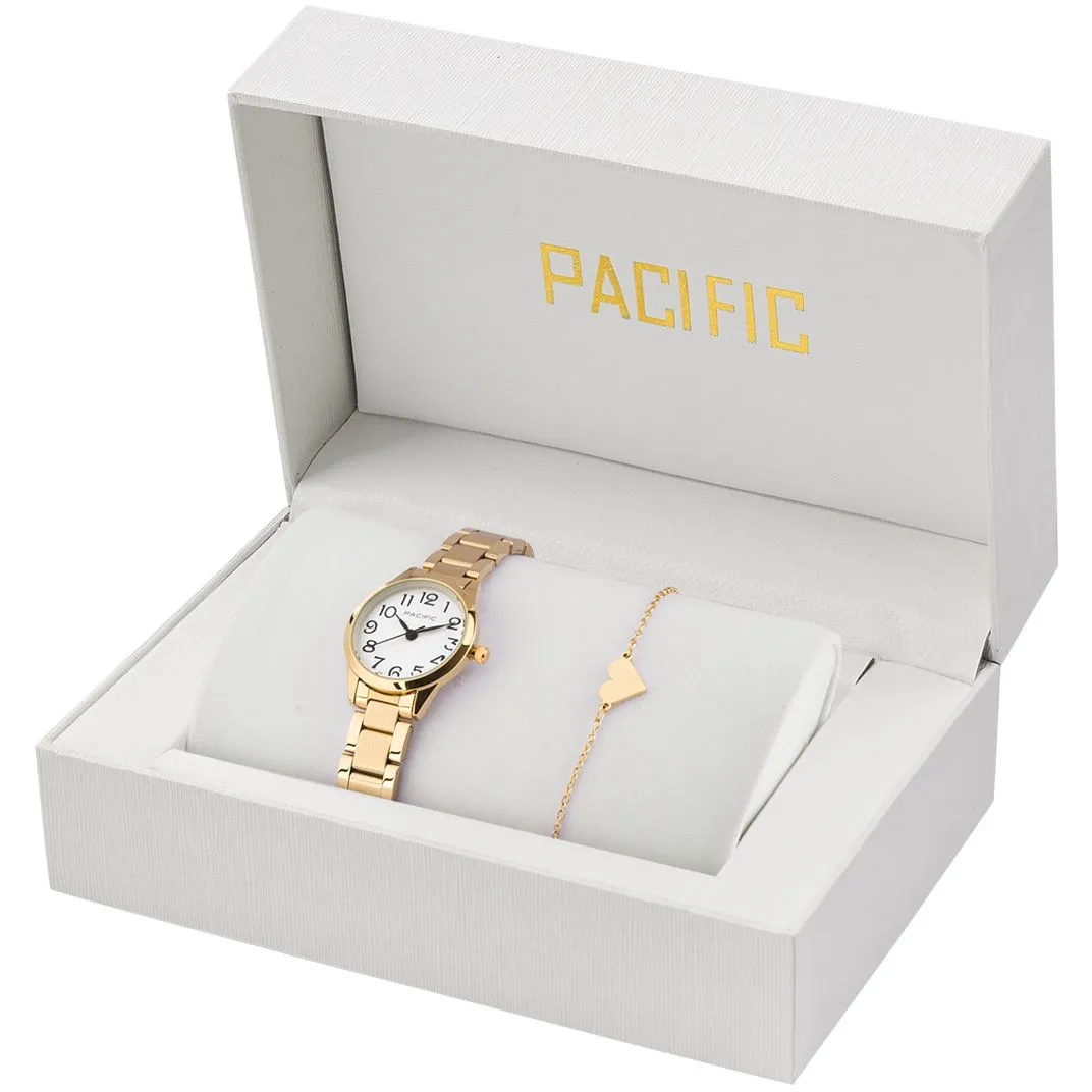 Zegarek damski Pacific X6159-22 - elegancja w duecie: złoty zegarek na bransolecie i bransoletka z sercem