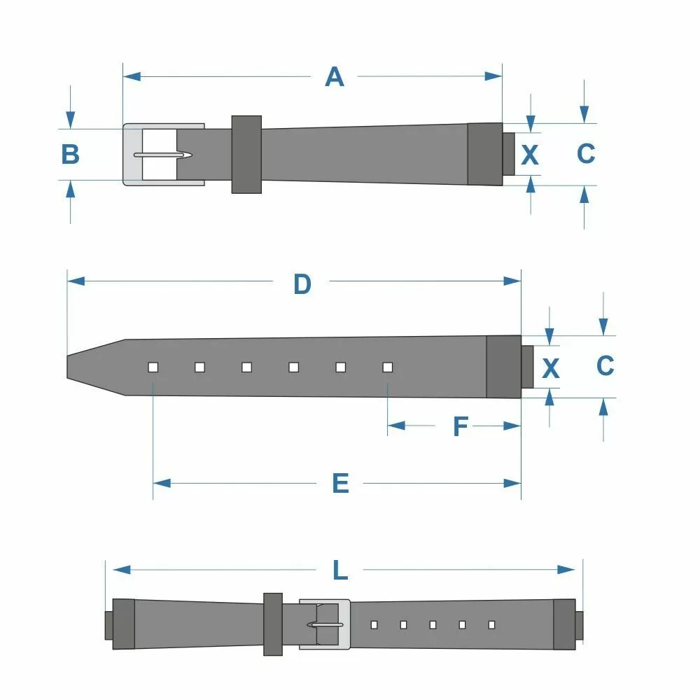 • Odległość od koperty zegarka do pierwszej dziurki F= 30 mm