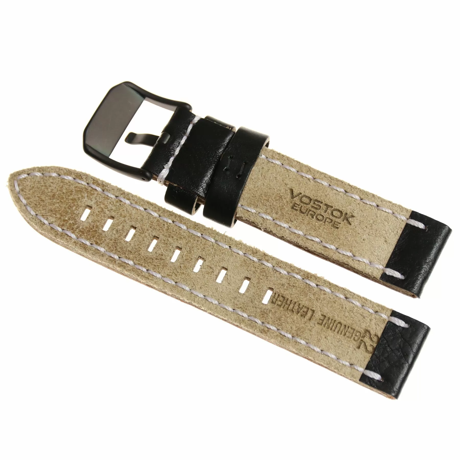 Pasek do zegarka Vostok Europe Pasek Almaz - Skóra (C257) czarny z białym przeszyciem czarna klamra