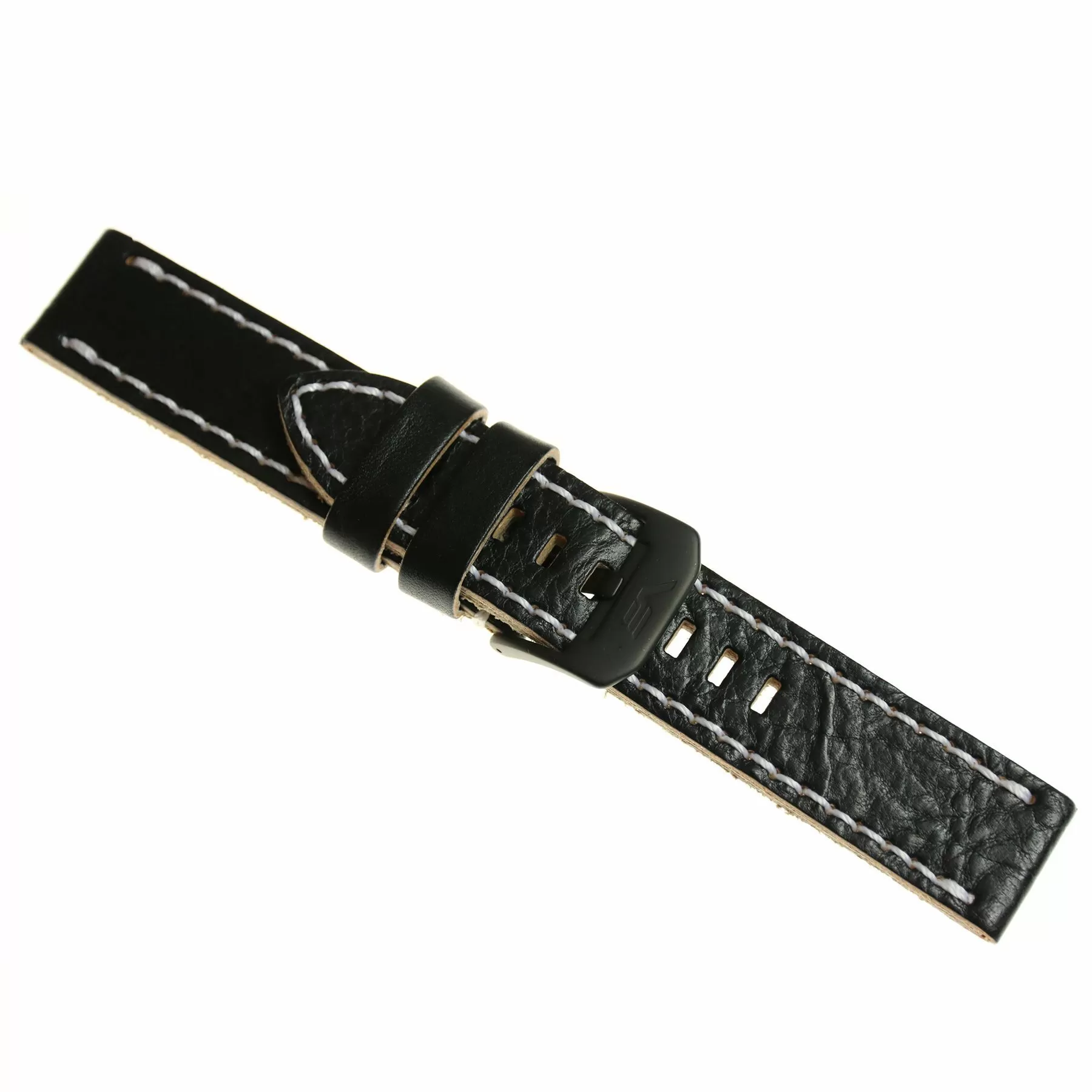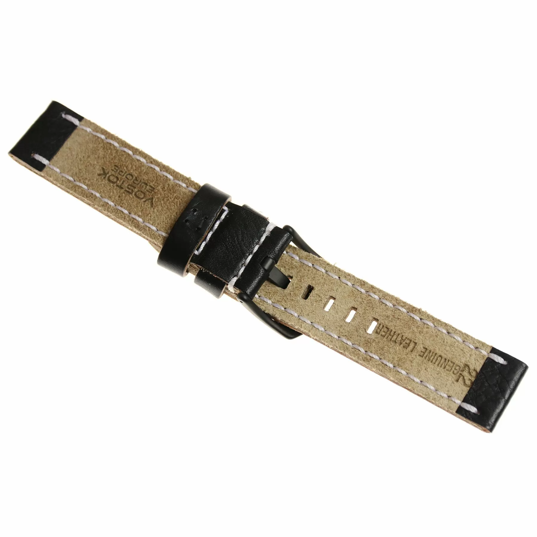 Pasek Vostok Europe Almaz skórzany czarny przeszyty białą nicią z czarną matową klamrą