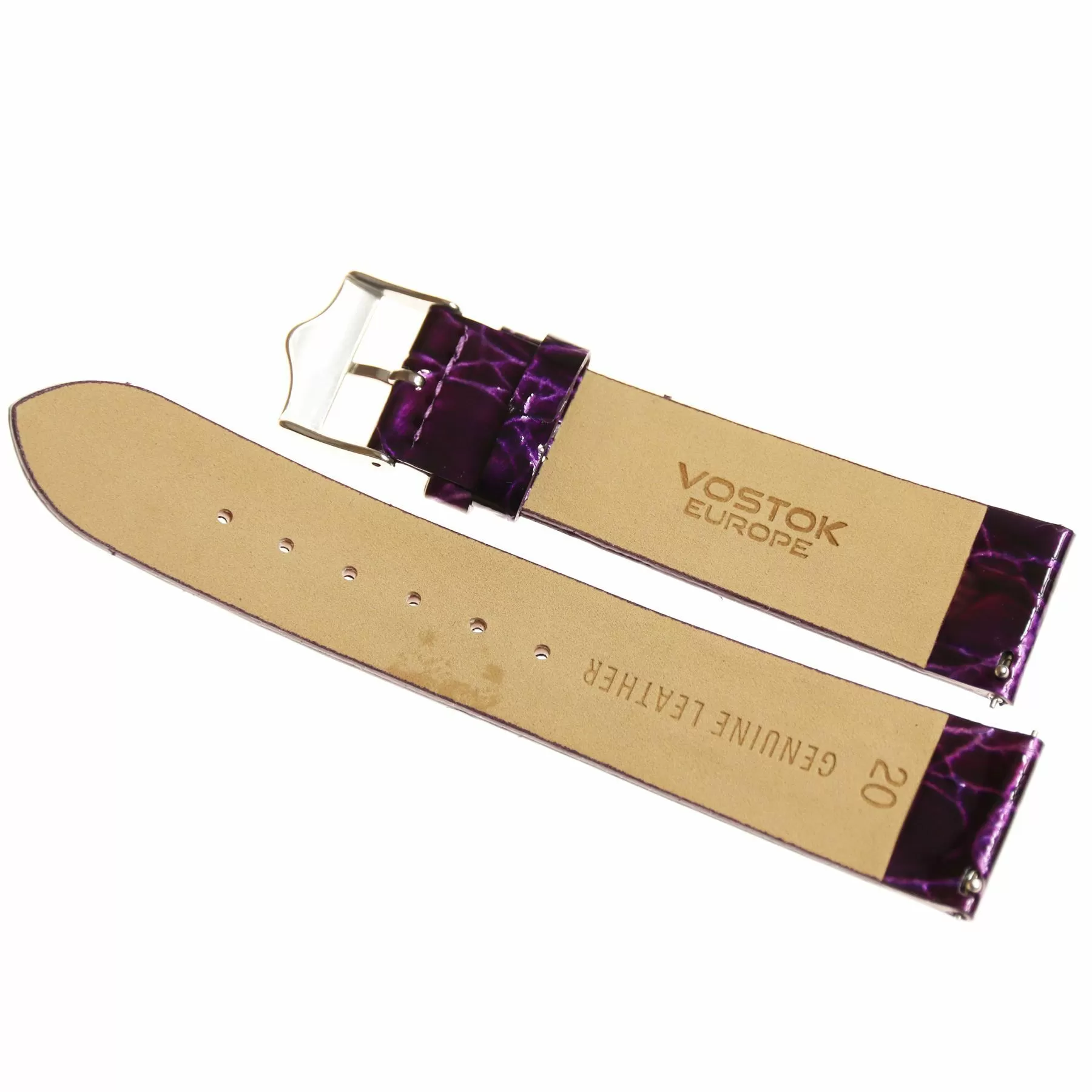 Oryginalny pasek skórzany w kolorze fiolet perłowym z fakturą croco wyposażony w klamrę  w kolorze srebrnym, pasek ten  przeznaczony jest do zegarka damskiego Vostok Europe. Pasek ten powstał do kolekcji N1 Rocket i charakteryzuje się on najwyższą jakością wykonania, oryginalną kolorystyką i pełną zamiennością z innymi modelami z tej linii.