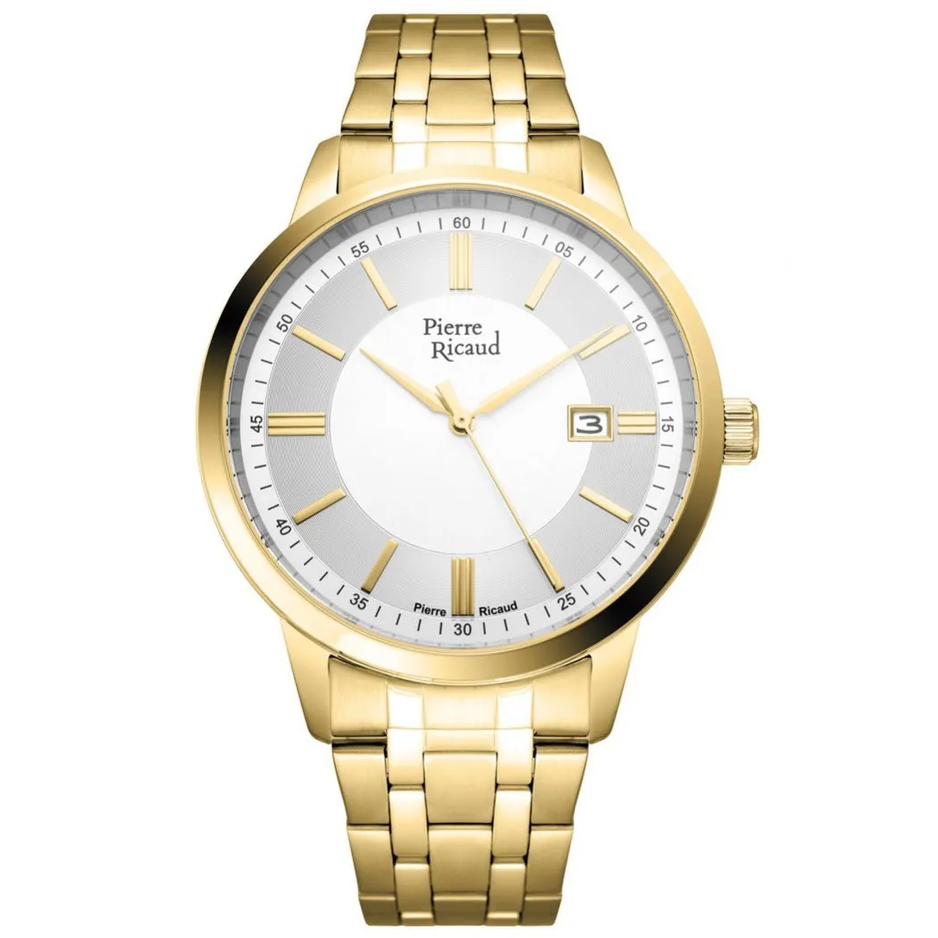 Złoty klasyczny zegarek męski Pierre Ricaud P97238.1113Q na bransolecie. Kwarcowy mechanizm Citizen.