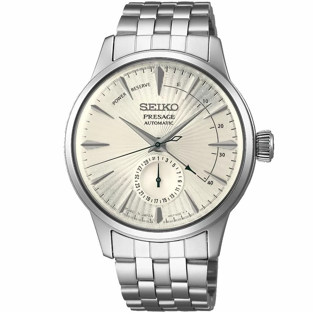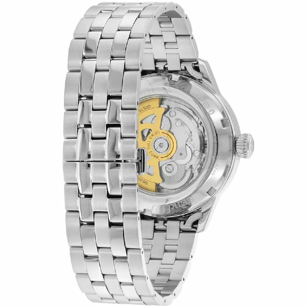 Zegarek Seiko SSA341J1 Cocktail łączy w sobie bogate doświadczenie marki oraz ponadczasowy design. Widać to zarówno w projekcie – zastosowano wysokiej jakości mechanizm mechaniczny z automatycznym naciągiem, kaliber 4R57 o 41 godzinnej rezerwie chodu, z dokładnością -35/+45 sekund na dobę (statycznie). Został on ukryty w wysokiej jakości okrągłej kopercie ze stali szlachetnej o polerowanym wykończeniu, która pod wzmacnianym szkiełkiem hardlex, chowa niesamowitą jasną tarczę, o promienistym wzorze, której znacznikami godzin są proste, srebrne indeksy. Jej odcień delikatnie połyskuje na grafitowy odcień. Elegancki charakter podkreślają zastosowane wskazówki o minimalistycznym kształcie. Całość znakomicie dopełnia stalowa bransoleta która idealnie komponuje się z tarczą. Luksusowy charakter podkreśla także przezroczyste, częściowo szklane wieczko, które pozwala dostrzec działanie mechanizmu.