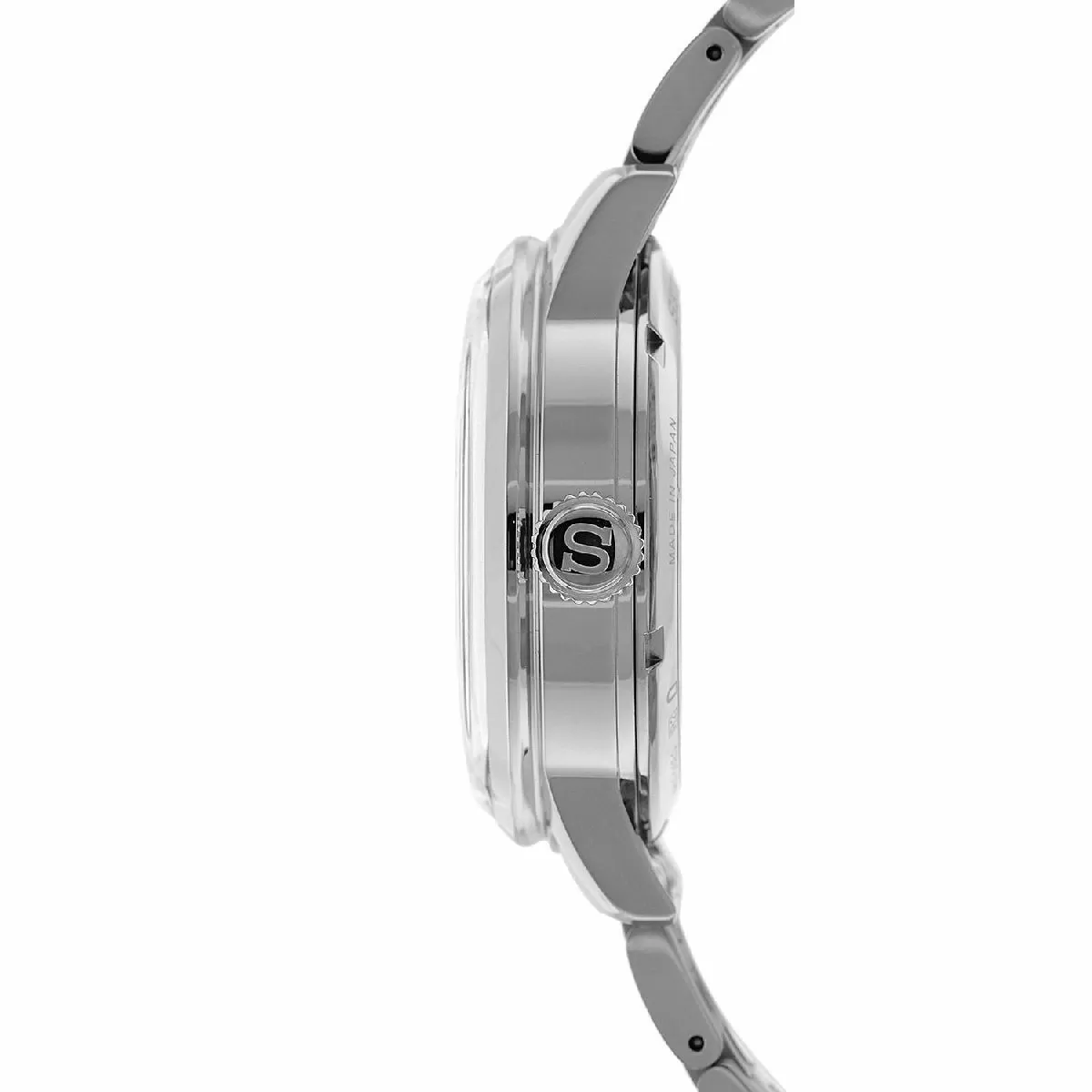 Klasyczna forma widoczna jest w każdy fragmencie zegarka Seiko SSA341J1. Na jasnej tarczy umieszczone są proste oznaczenia, a w dolnej części cyferblatu znajduje się dodatkowa tarcza, ze wskazaniem daty. W niepełnym półokręgu od godziny 12 do około 4 znajduje się skala ze wskazaniem poziomu rezerwy chodu, wskazywanym przez wskazówkę z czarnym grotem. Z boku koperty znajduje się ozdobna, żłobiona koronka, służąca do ustawienia zegarka.