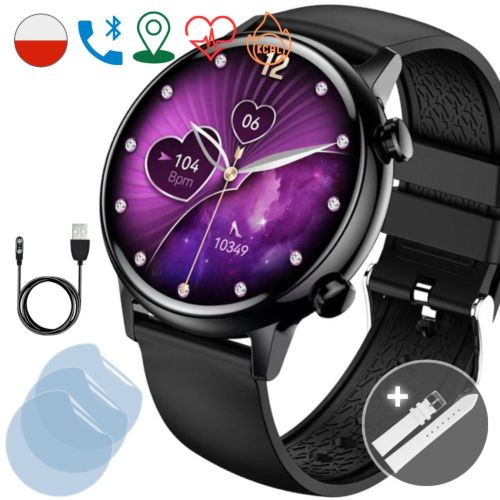 Smartwatch damski Rubicon Love Amoled czarny + biały pasek + ochrona ekranu
