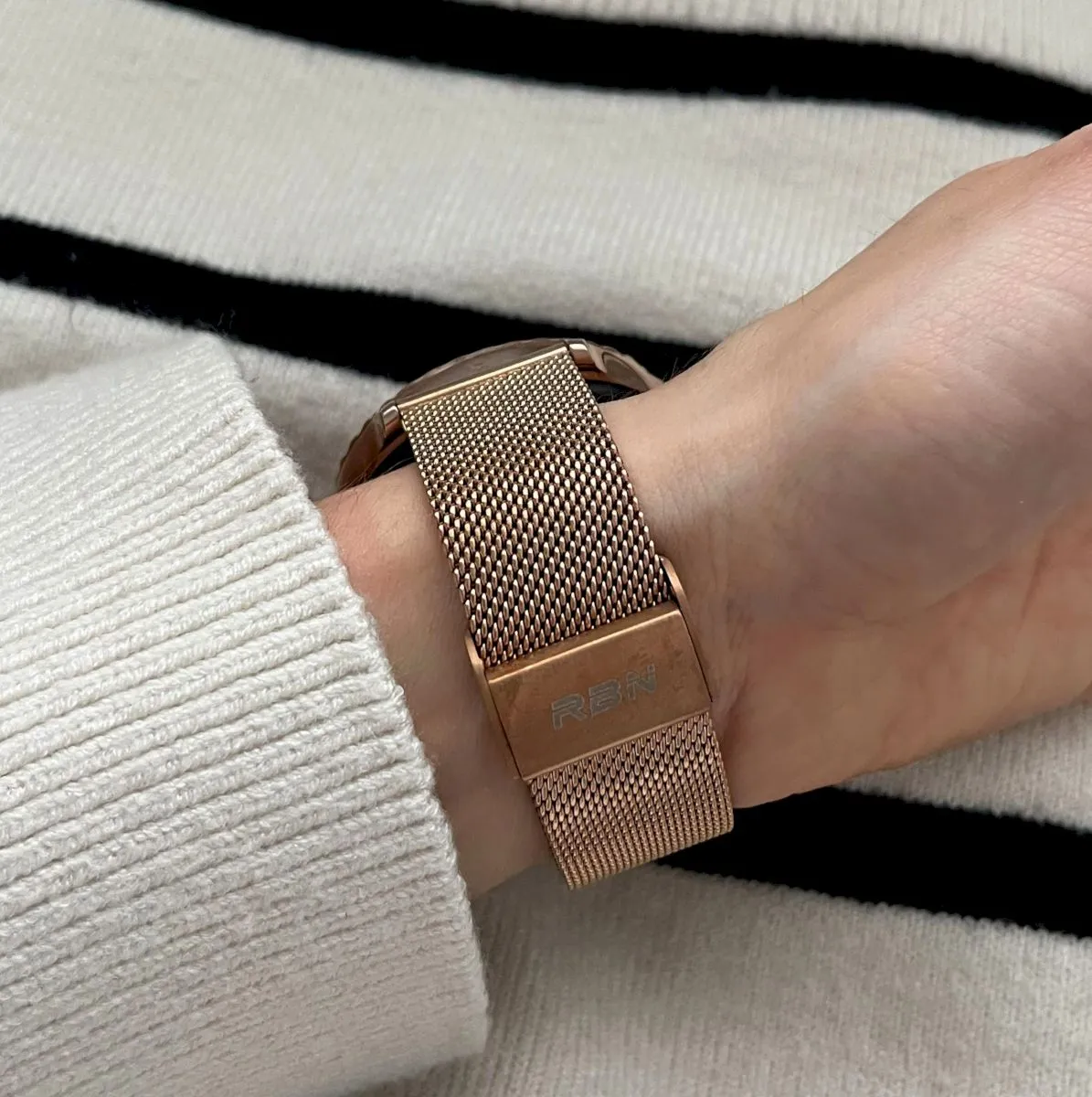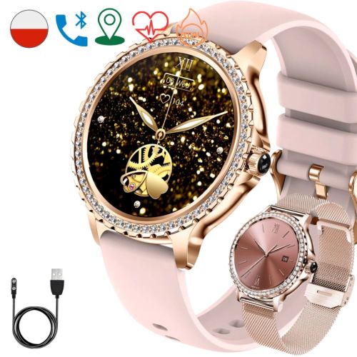 • W zestawie smartwatch, różowy pasek, różowozłota bransoletka typu mesh oraz kabel do ładowania