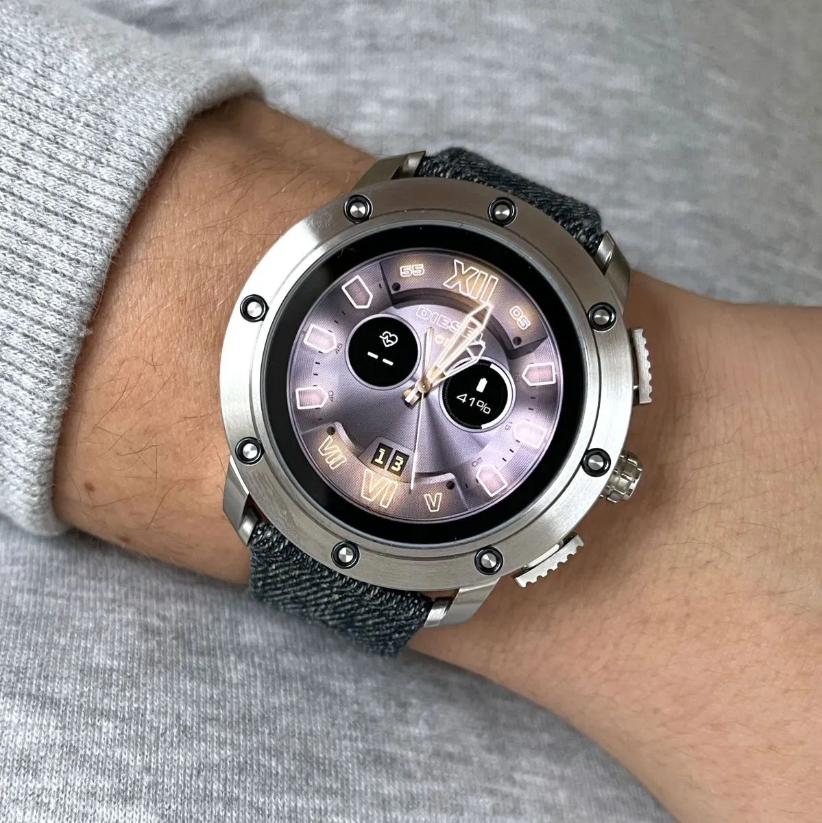 Kupiłem ten smartwatch ze względu na przywiązanie do marki i jej zegarków w klasycznej, analogowej odmianie. Oceniłbym zegarek dwutorowo. Po pierwsze to co daje marka Diesel (w tym przypadku we wspolpracy z Fossil, co jest niewątpliwą zaletą) oraz oddzielam od tej pierwszej funkcjonowanie android Wear (system). Zatem samo urządzenie bardzo ładne, ponadprzeciętnie solidnie wykonane, wygląda drogo, świetny pasek i na pewno prezentuje się znacznie lepiej na żywo i z innymi tarczami, które na szczęście są do wyboru, bo to fioletowe coś na grafice jest paskudne. Teraz kwestia androida. Czy tak trudno po tylu latach jest odpatrzeć od Apple jak to się robi? To tyle. Po prostu android - upierdliwy, niestabilny, nieintuicyjny, wolny system, który ciągle coś sobie sam zmieni/zaktualizuje etc. Tak po krótce: - gdyby ten zegarek był na systemie os od apple, to dla mnie wart byłby 2-3 tysiące PLN - jednak Android to jego najsłabszy punkt i ok, nadal fajny gadżet, ale za max 1 tysiąc PLN, bo wg mnie zegarek z androidem nie jest więcej warty.