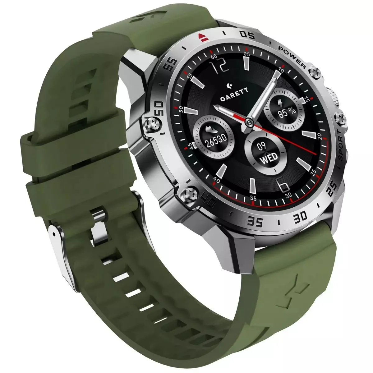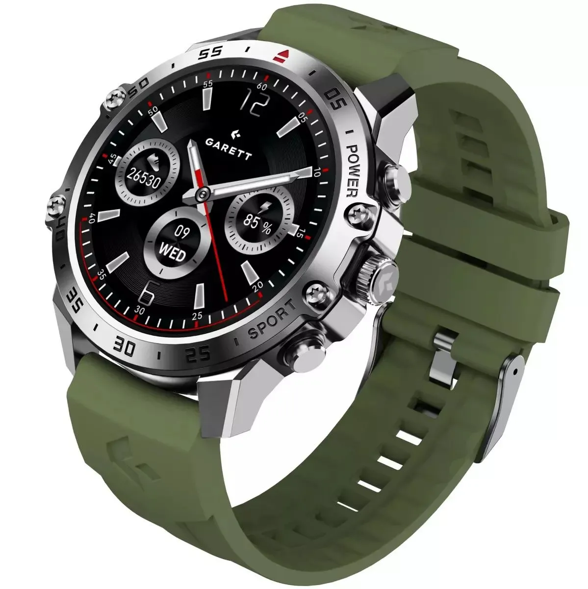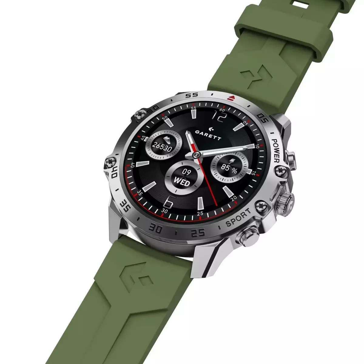 Męski Smartwatch Garett V14 srebrny stalowy z silikonowym zielonym paskiem jest masywny, wygodny i solidnie wykonany, pozwala na skorzystanie z przydatnych funkcji smart, takich jak 100 trybów sportowych i Bluetooth.