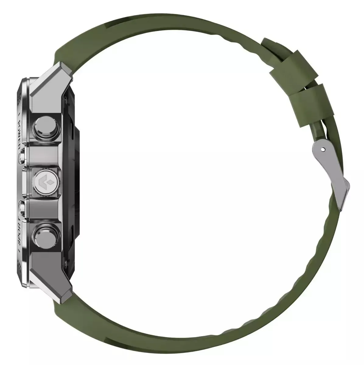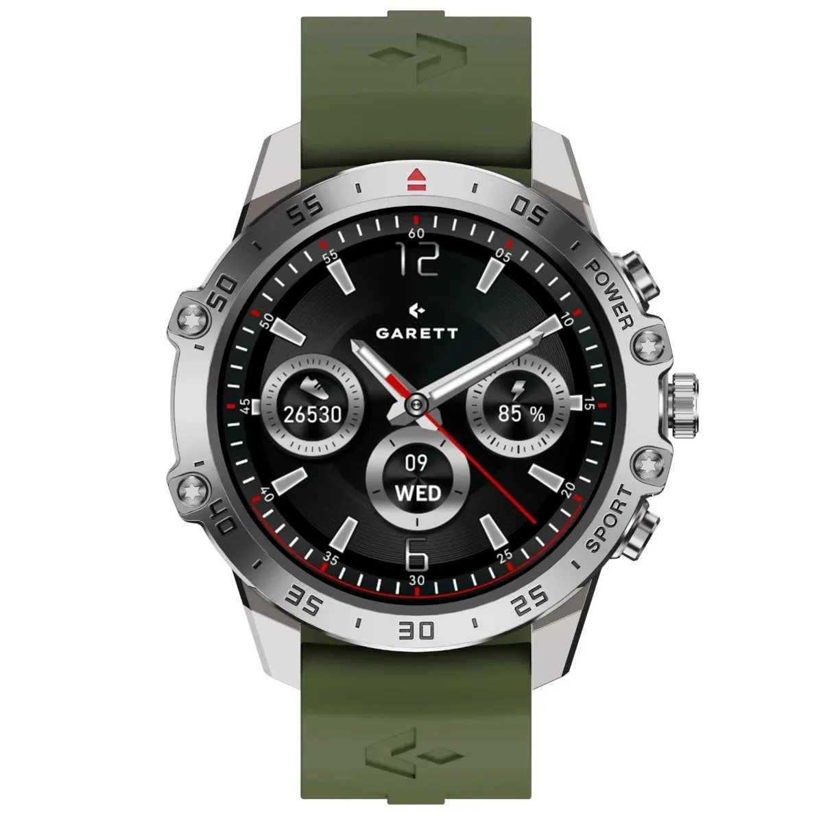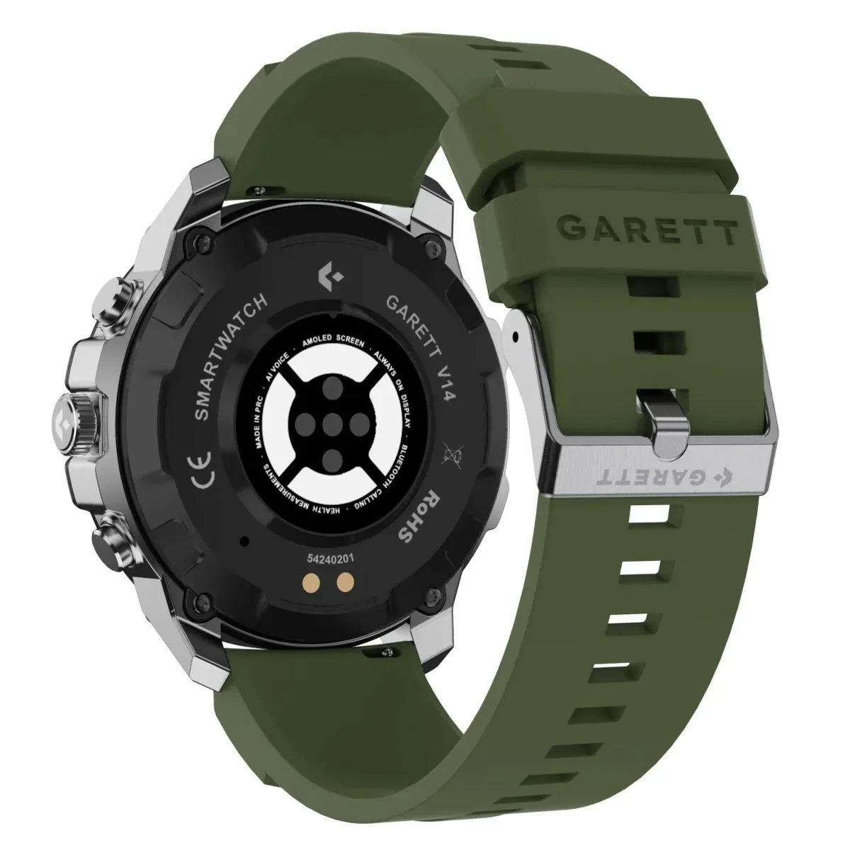 Męski Smartwatch Garett V14 srebrny stalowy z silikonowym zielonym paskiem jest masywny, wygodny i solidnie wykonany, pozwala na skorzystanie z przydatnych funkcji smart, takich jak 100 trybów sportowych i Bluetooth.