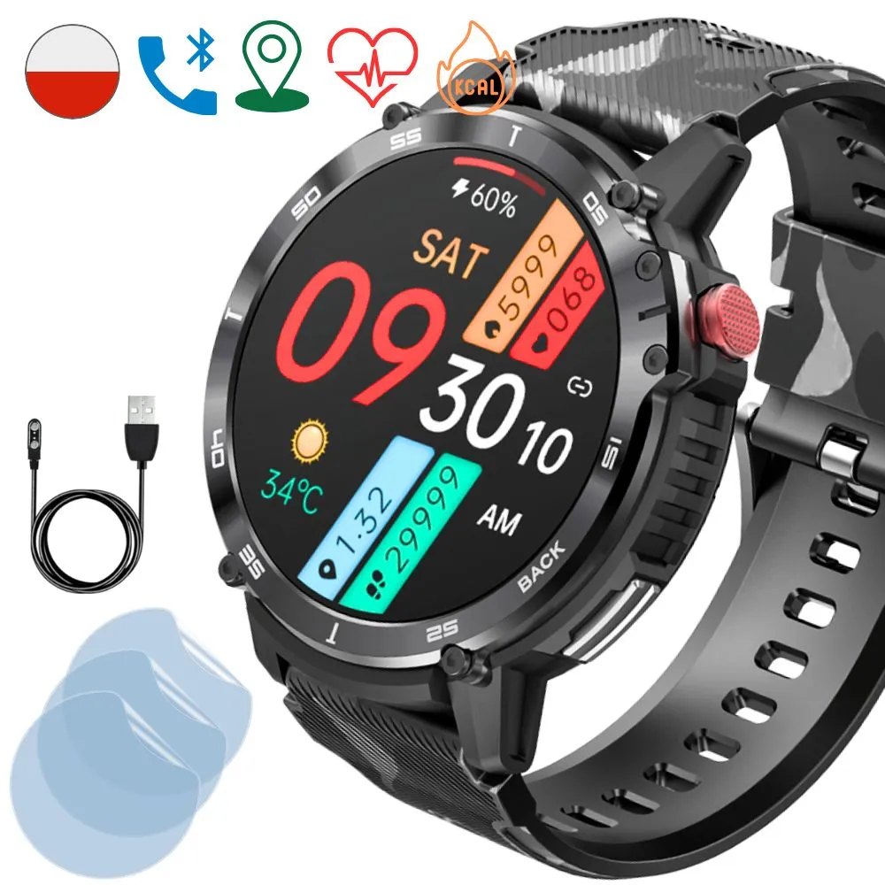 Męski zegarek smartwatch z funkcją rozmowy oraz wbudowaną pamięcią na muzykę! Idealna opcja dla każdego nowoczesnego mężczyzny. Prócz tego oczywiście smartwatch Rubicon Military oferuje najpotrzebniejsze funkcje smart, takie jak powiadomienia z aplikacji, pulsometr, ciśnieniomierz, monitor snu i wiele innych!
