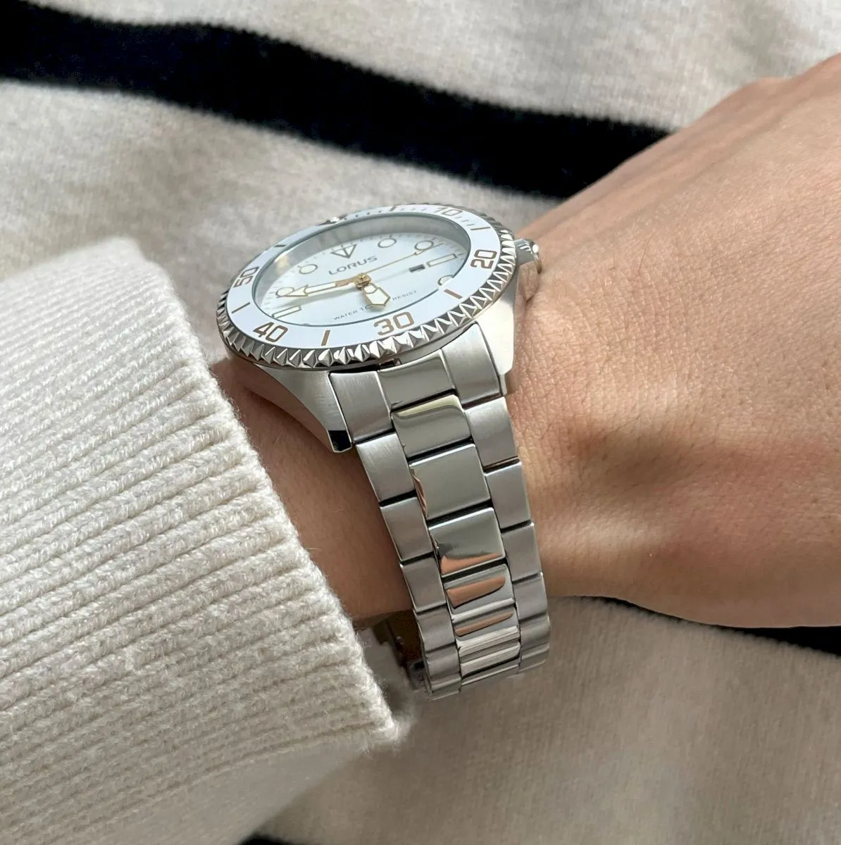 Damski zegarek Lorus w odcieniu srebra z możliwością pływania z zegarkiem