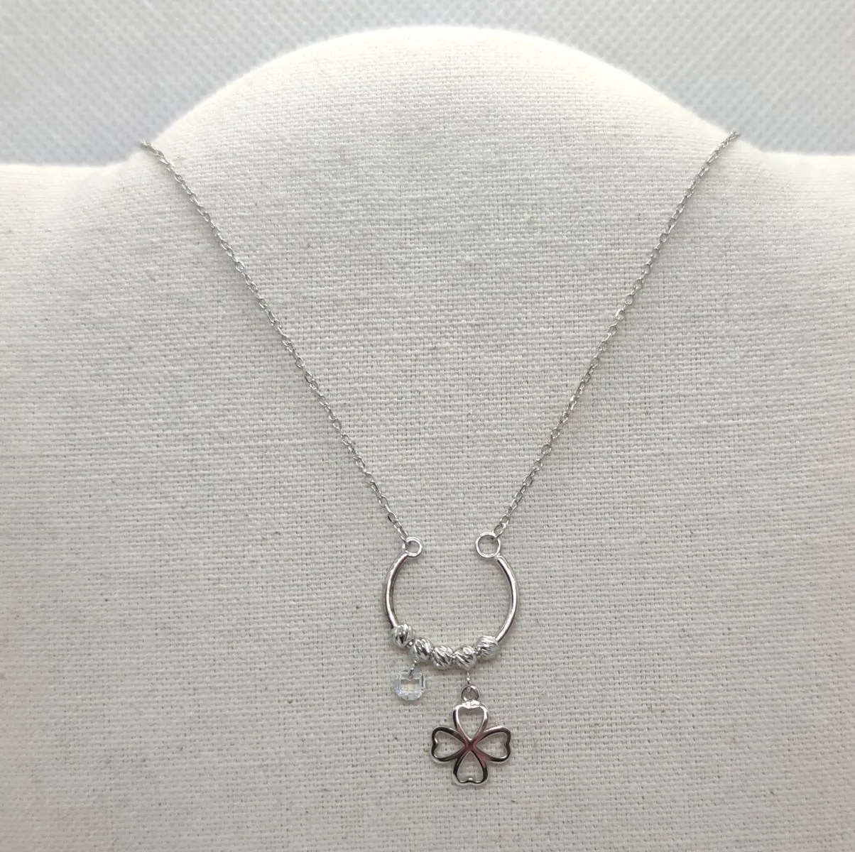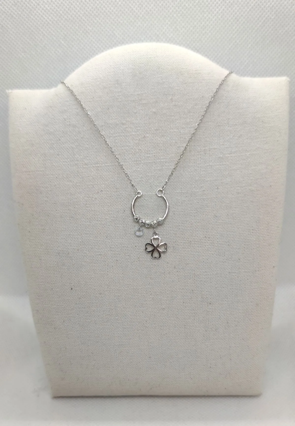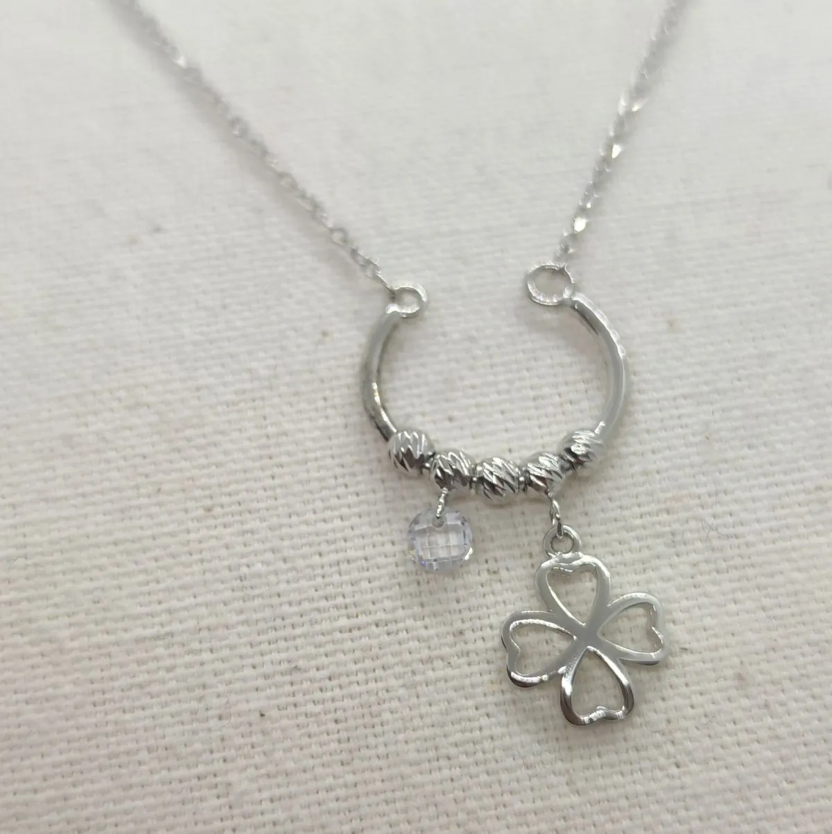 Łańcuszek damski wykonany ze srebra próby 925. Cechą charakterystyczną jest bardzo oryginalna  zawieszka w kształcie sztywnej podkowy na której umieszone sa wiszaca koniczyna ,cyrkonia, a także ozdobne srebrne kuleczki. Produkt będzie stylowym dodatkiem do każdej stylizacji, zarówno na co dzień jak i podczas wytwornych przyjęć.