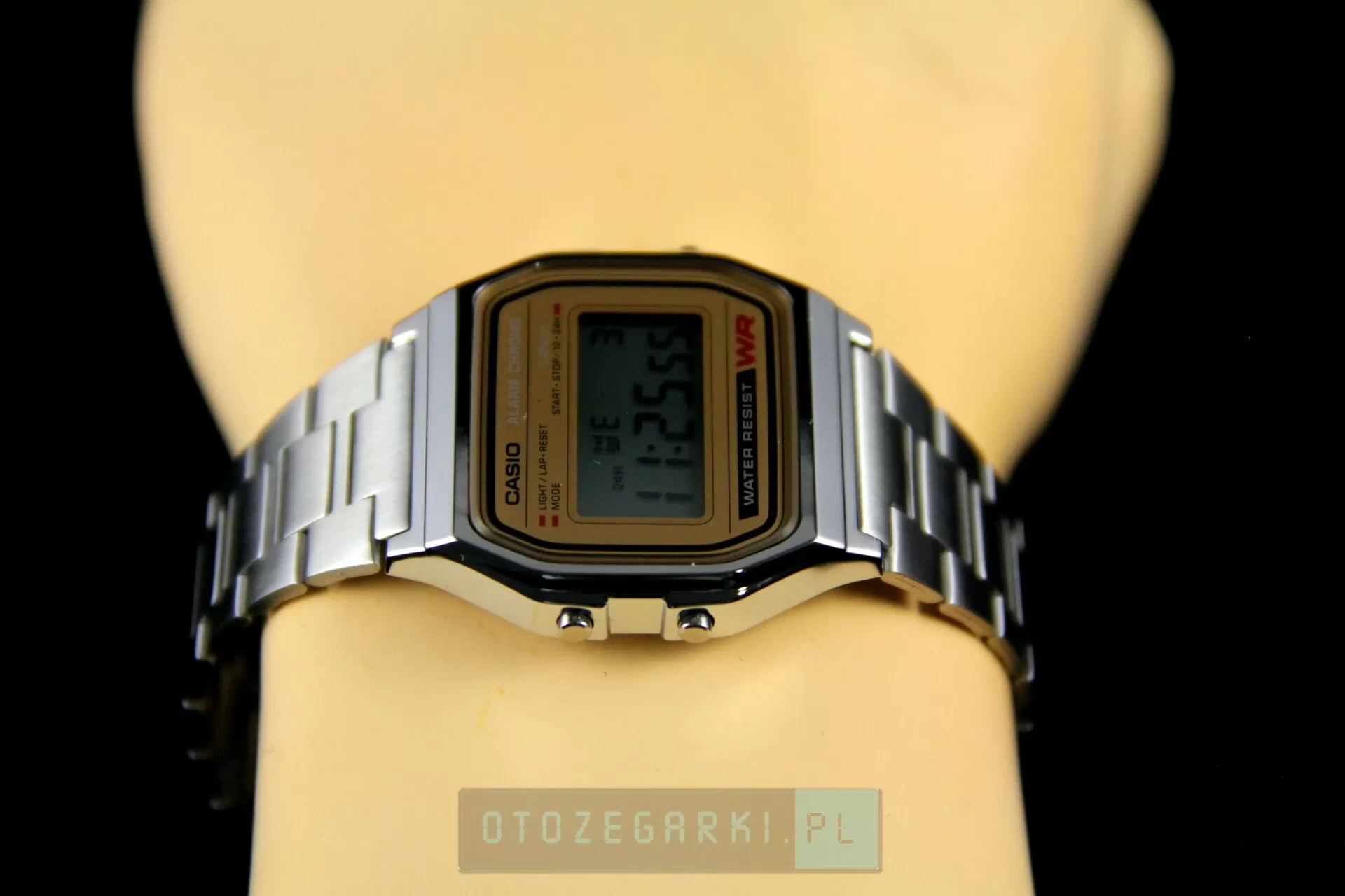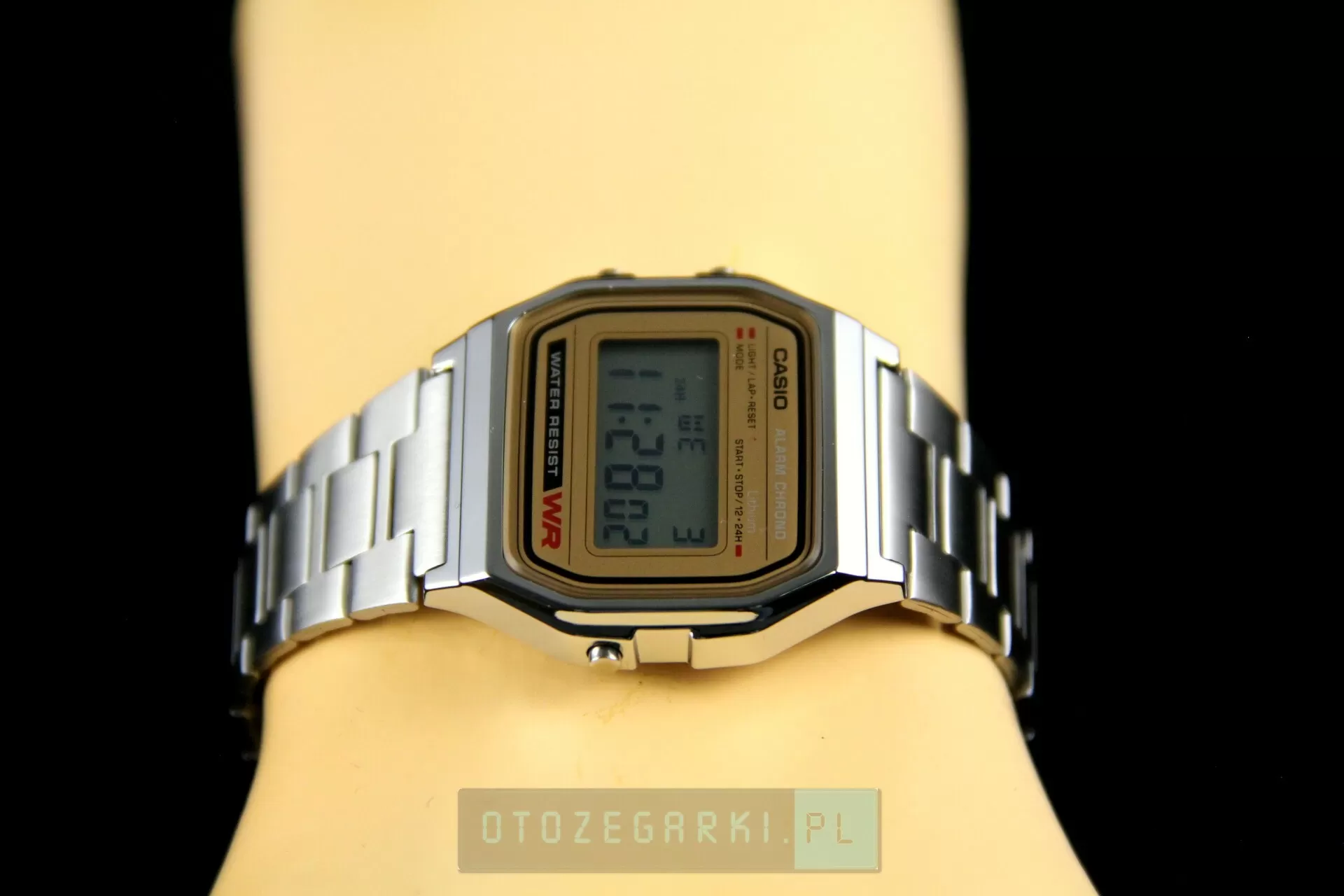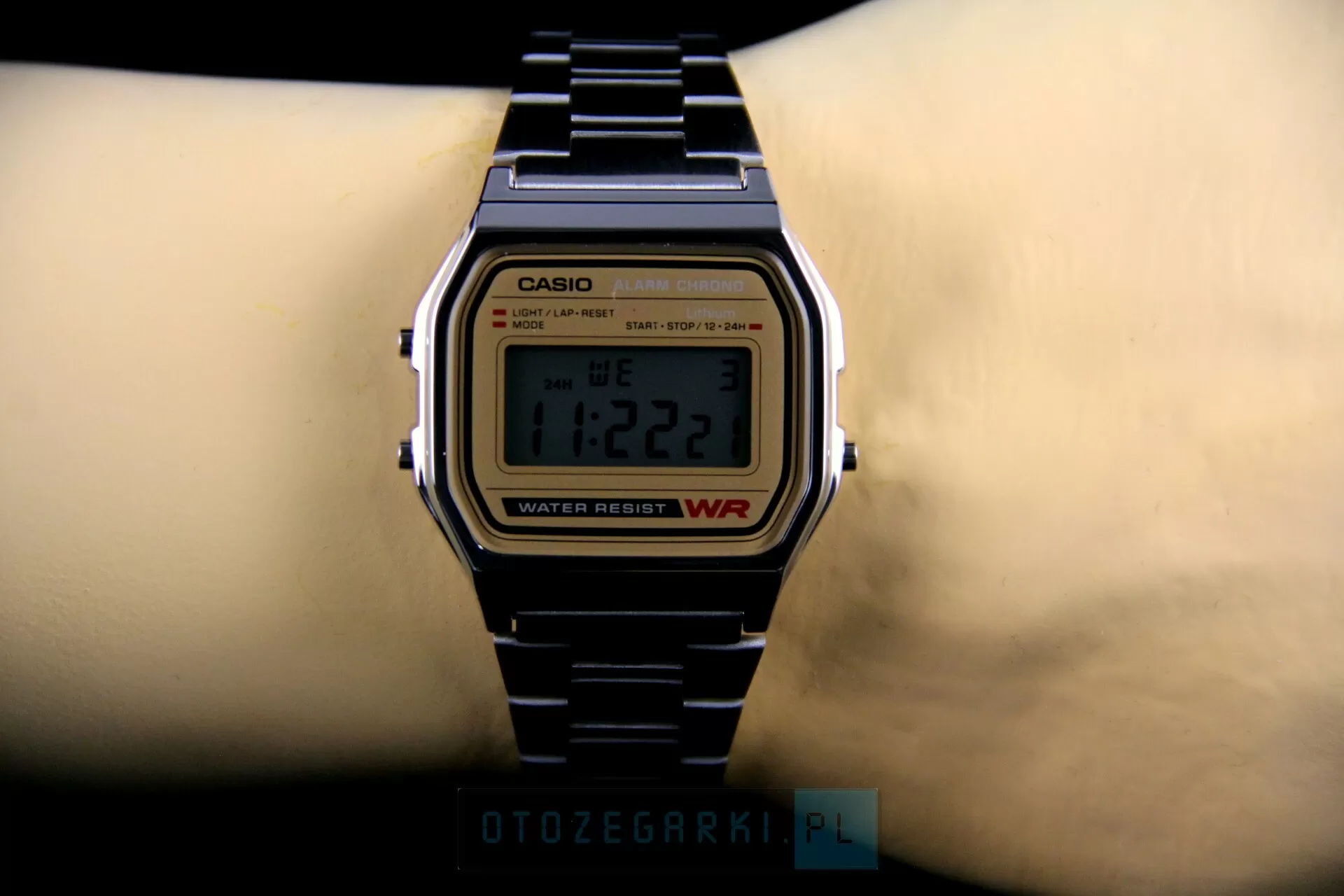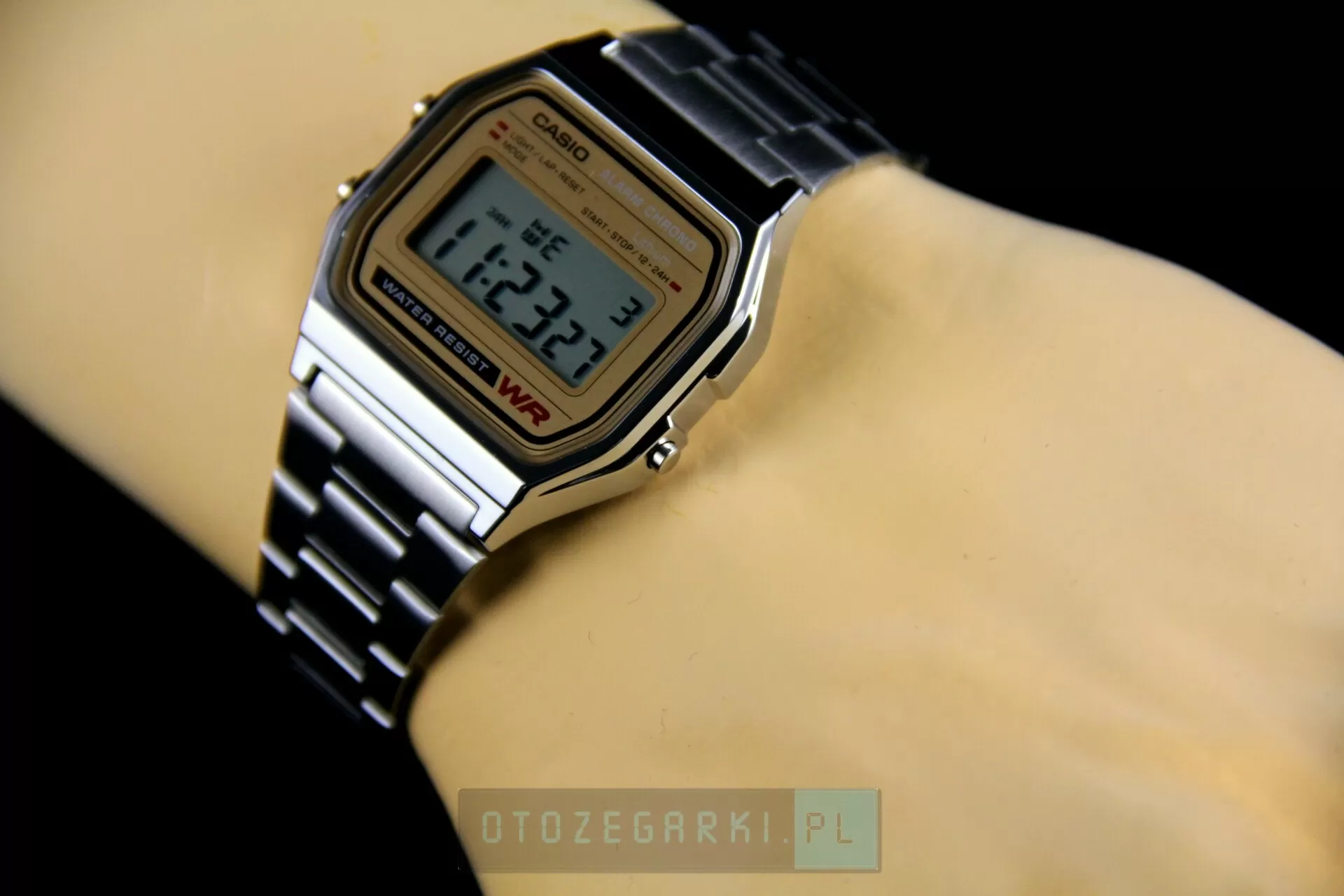Casio A158WEA-9EF Sport A158WEA 9EF jest sportowym zegarkiem, który doskonale nadaje się zarówno dla kobiet, jak i mężczyzn. Oryginalna oldschoolowa stylistyka, świetnie komponuje się ze srebrno - beżową kolorystyką zegarka. Prostokątna koperta z wysokiej jakości tworzywa sztucznego została zamocowana na solidnej bransolecie z antyalergicznej stali szlachetnej, odpornej na szkodliwe działanie czynników atmosferycznych. Sercem czasomierza Casio A158WEA-9EF jest precyzyjny mechanizm kwarcowy, napędzany baterią o 7 letniej żywotności. Elektroniczny wyświetlacz został wyposażony w podświetlenie diodowe LED, które umożliwia kontrolę czasu w ciemności. Tarczę zegarka Casio A158WEA-9EF przykrywa wytrzymałe i elastyczne szkiełko syntetyczne. Zegarek Casio A158WEA-9EF posiada funkcjonalne wyposażenie, którym jest alarm dzienny, stoper odmierzający czas z dokładnością do 1/100 sekundy, dokładny datownik i automatyczny wieczny kalendarz oraz podwójny czas pozwalający na pomiar godziny w trybie 12 lub 24 godzinnym. Wodoszczelność zegarka Casio A158WEA-9EF - w klasie 3 atm (30 m) - chroni go przed zachlapaniem, w trakcie mycia rąk lub deszczu.