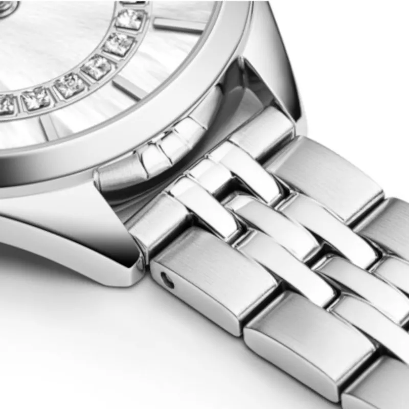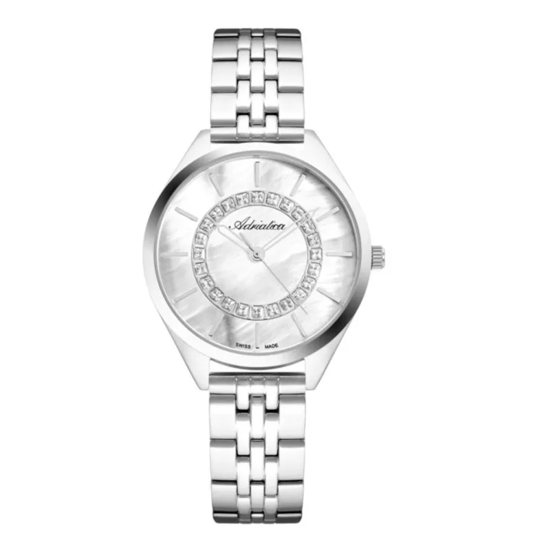 Zegarek damski Adriatica A3817.511FQ to elegancki produkt, wykonany z niezwykle ogromną dbałością o szczegóły, szczególnie zachwyca jego masa perłowa na tarczy. Jak wszystkie zegarki Adriatica, model A3817.511FQ został stworzony w oparciu o długoletnią historię zegarmistrzowską. Solidne, dokładne i niezawodne, takie właśnie muszą być zegarki damskie opatrzone logiem Swiss MadeZegarek Adriatica działa na precyzyjnym mechanizmie kwarcowym, zasilanym za pomocą baterii, który charakteryzuje się wysoką dokładnością w pomiarze czasu - zakres tolerancji wynosi ok. +/- 15 sekund w przeciągu 30 dni. Koperta, o szerokości 34.00 mm, jaką posiada zegarek Adriatica A3817.511FQ wykonana została z antyalergicznej, odpornej na korozję, wysokiej jakości stali szlachetnej i ma kolor srebrny.