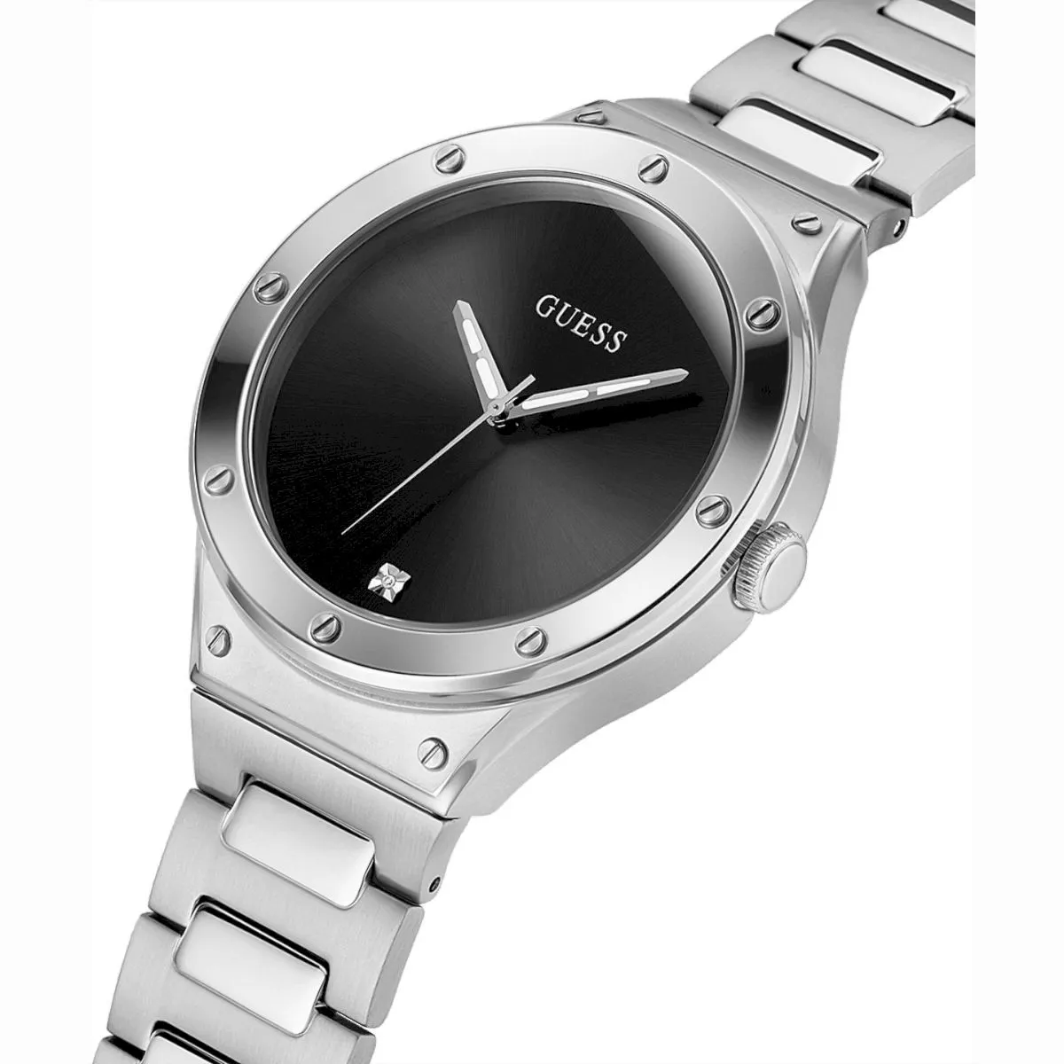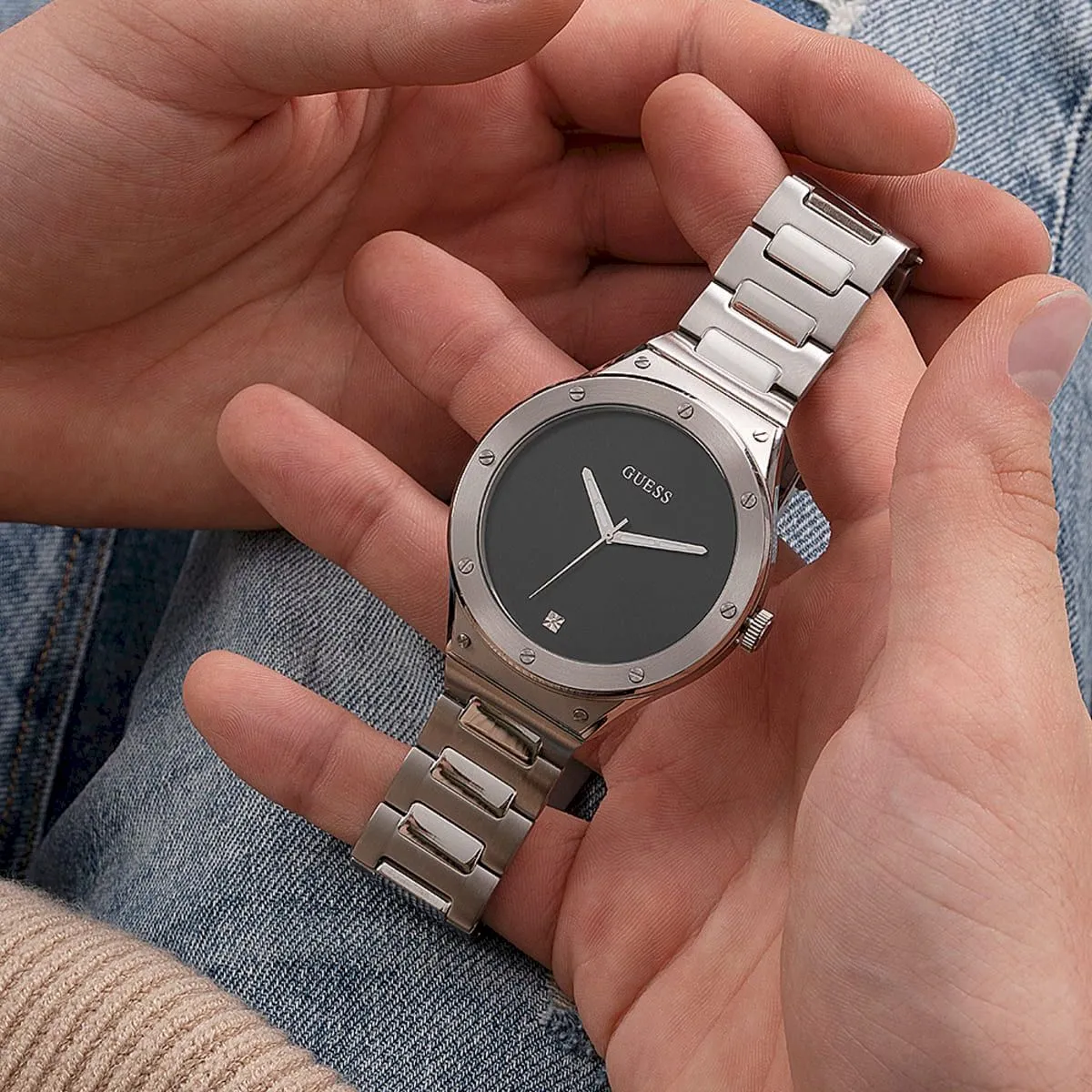 Zegarek Guess GW0427G1 to nowoczesny model z bransoletą wykonaną ze stali szlachetnej w srebrnym kolorze i czarną tarczą w eleganckim stylu. Stworzony z myślą o wszystkich, który lubią markowe i nietuzinkowe dodatki o niepowtarzalnym charakterze.