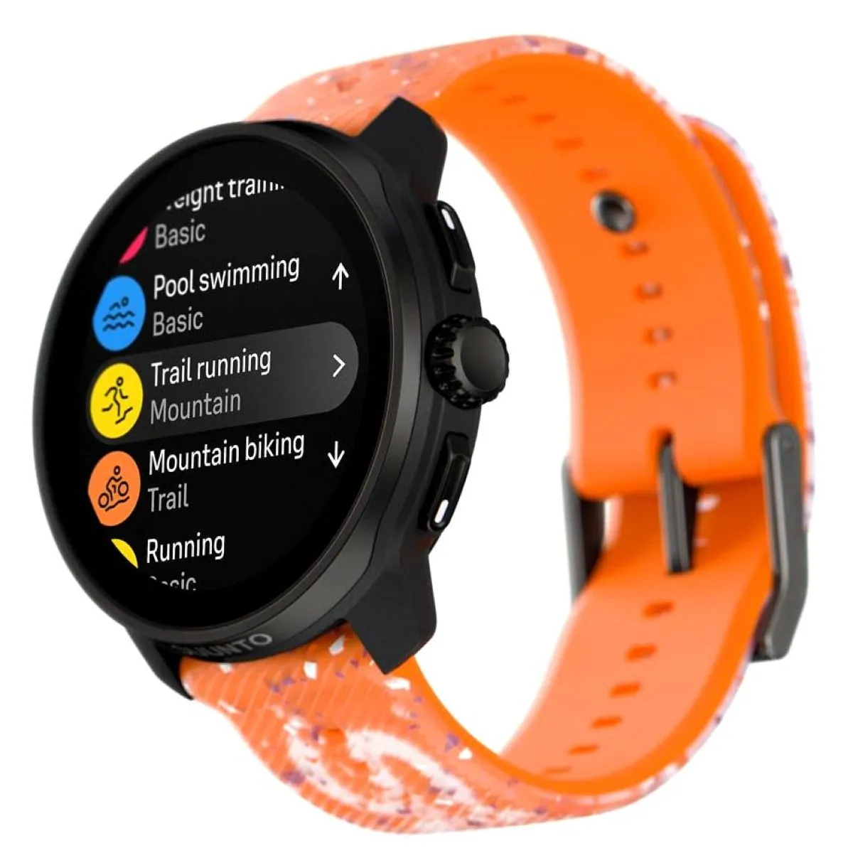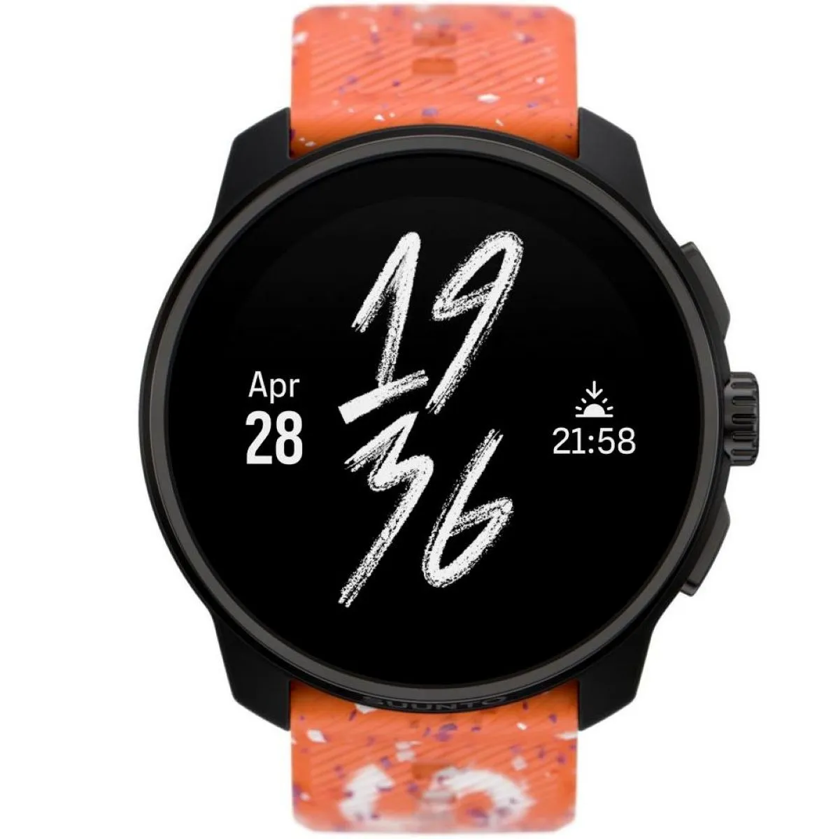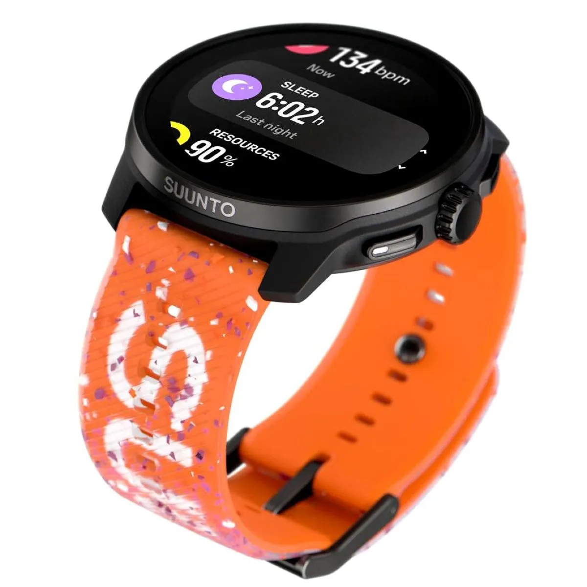 SUUNTO Race S Power Orange pomarańczowy zegarek do biegania SS051016000 - tarcza z czarnej stali nierdzewnej, czarna koperta oraz pomarańczowy silikonowy pasek z fioletowym gradientem, z logo SUUNTO i kolorowymi drobinkami.