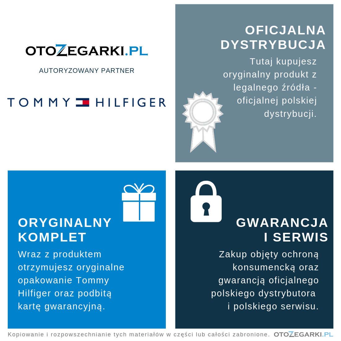 Kupując u nas w sklepie nie musisz obawiać się rozczarowania! Wszystkie zegarki Tommy Hilfiger i biżuteria Tommy Hilfiger z naszej oferty to oryginalne, nowe i pełnowartościowe produkty, które pochodzą z legalnej polskiej dystrybucji, która także zapewnia serwisowanie w Polsce i dostęp do części. Zakup w naszym sklepie jest całkowicie legalny i zgodny z polskim prawem, co gwarantuje Ci ochronę jako konsumenta w przypadku zakupów na odległość! Przy zakupie zegarka lub biżuterii Tommy Hilfiger otrzymujesz: