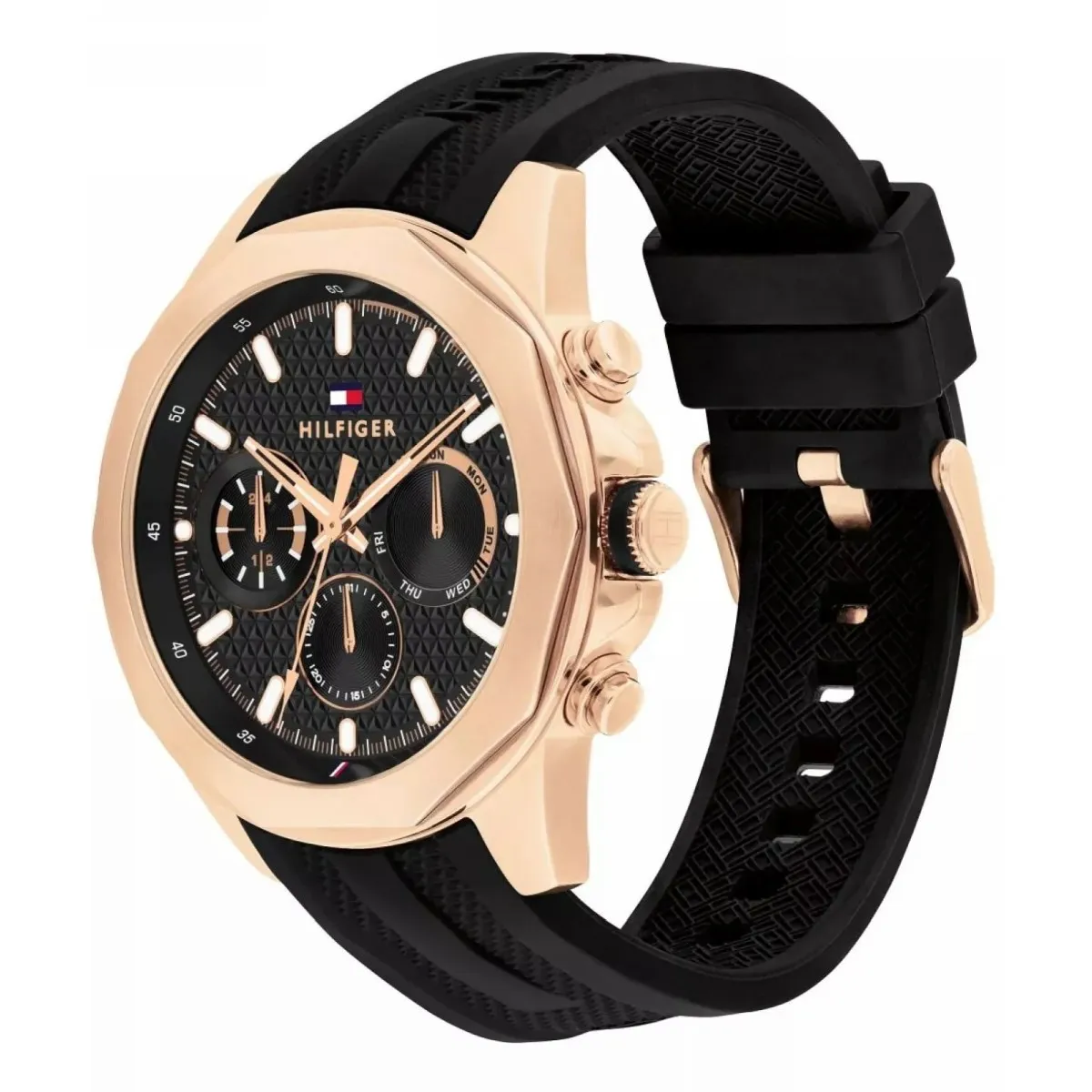 Zegarek Tommy Hilfiger Lars 1710650 z kwarcowym mechanizmem, w różowozłotej obudowie, z czarnym silikonowym paskiem, posiada czarną tarczę, to połączenie klasycznego designu i nowoczesnych funkcji. Dodatkowo funkcja multidatownika oraz 5ATM wodoszczelności.