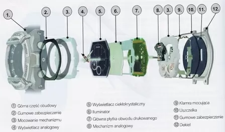 Funkcje Alarm , Czas światowy , Datownik , Podświetlenie , Shock resistant , Stoper , Timer , Wieczny kalendarz