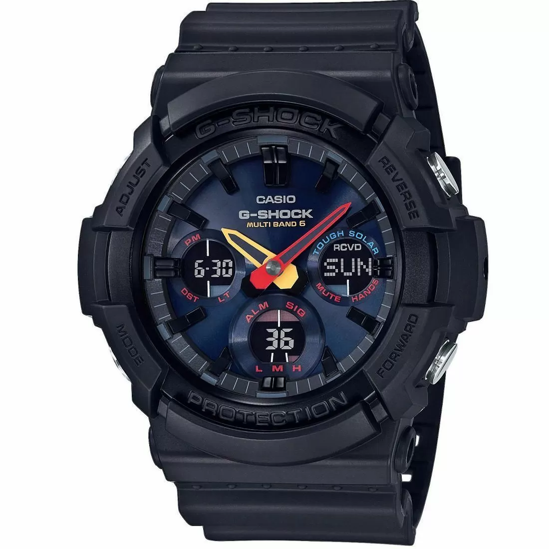 Sportowy zegarek Casio GAW-100BMC-1AER z kolekcji G-SHOCK, to unikatowy model który ożywi każdą stylizację. Dobrane połączenie kolorystyczne czerni, granatu i akcentów czerwieni oraz żółci sprawia, że zegarek ten doskonale prezentuje się na nadgarstku użytkownika, a użyte do produkcji materiały zapewniają komfort oraz wygodę podczas noszenia. Koperta od zewnątrz zamknięta jest przez mineralne, mocno utwardzone szkiełko, które jest bardzo odporne na pęknięcia i stłuczenia. Sercem modelu Casio GAW-100BMC-1A jest precyzyjny, kwarcowy mechanizm, którego działanie zapewnia akumulator, który kumuluje energię elektryczną pozyskaną z przetworzenia promieni światła absorbowanych przez zegarek. Model ten tak jak każdy zegarek z serii G-SHOCK jest wstrząsoodporny i wodoszczelny na poziomie 20ATM, co pozwala na kąpiel, pływanie powierzchniowe oraz zanurzenie z akwalungiem do około dziewięciu metrów w warunkach pozalaboratoryjnych. Męski zegarek GAW-100BMC-1AER został wyposażony w funkcje alarmu, stopera, timera, datownika, czasu światowego, wiecznego kalendarza, podświetlenia oraz systemu Radiocontrol, którego działanie polega na codziennej kalibracji wskazywanego na zegarku czasu zgodnie z zegarem atomowym.