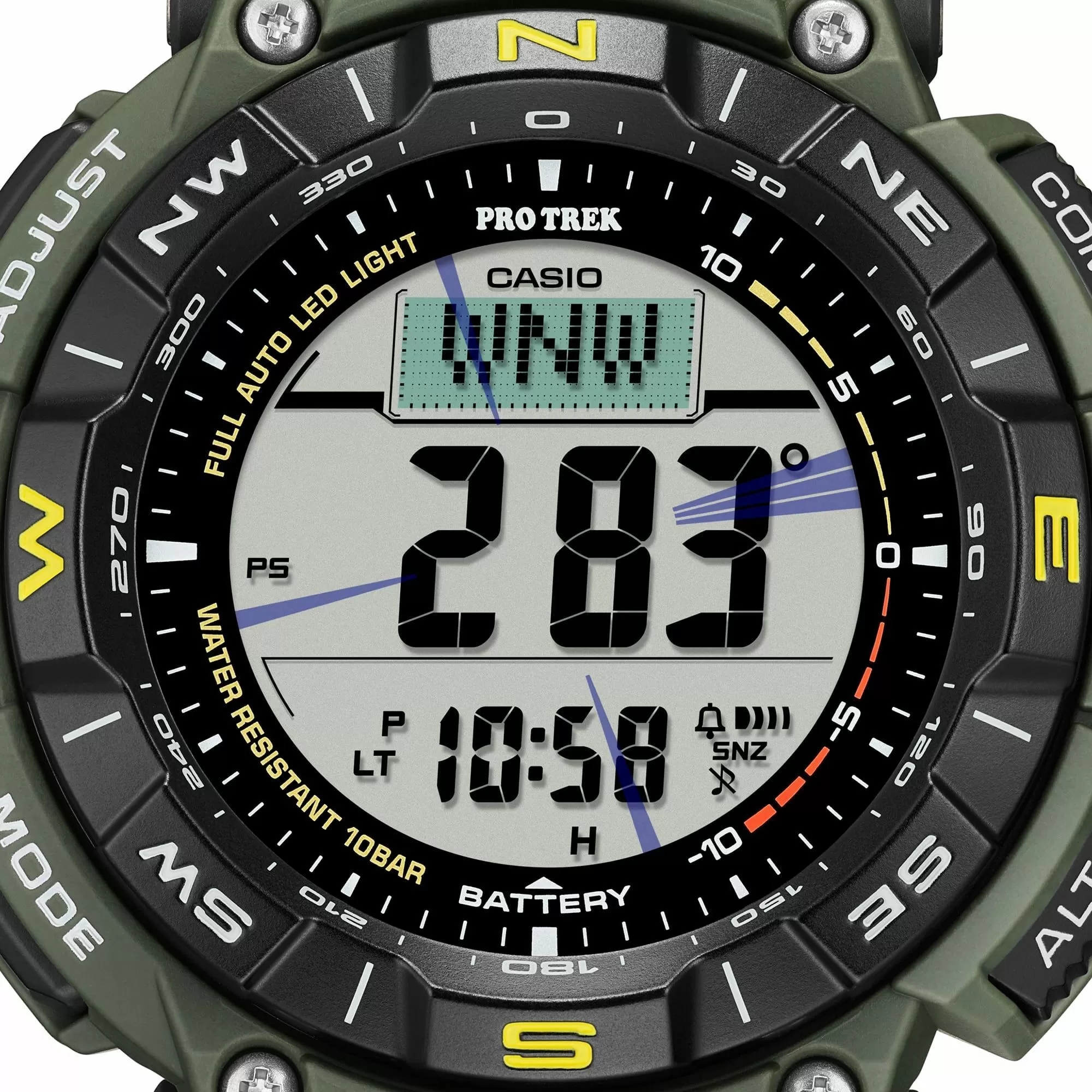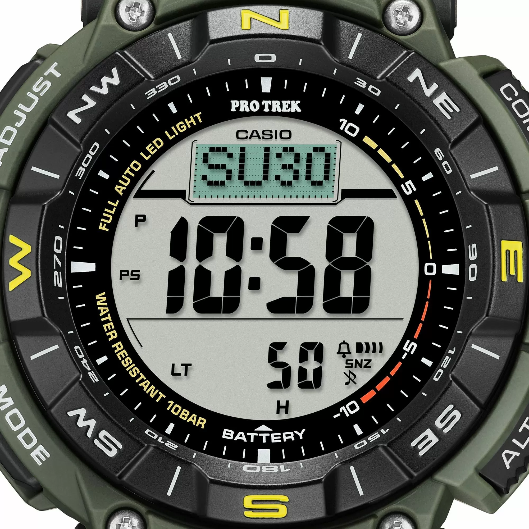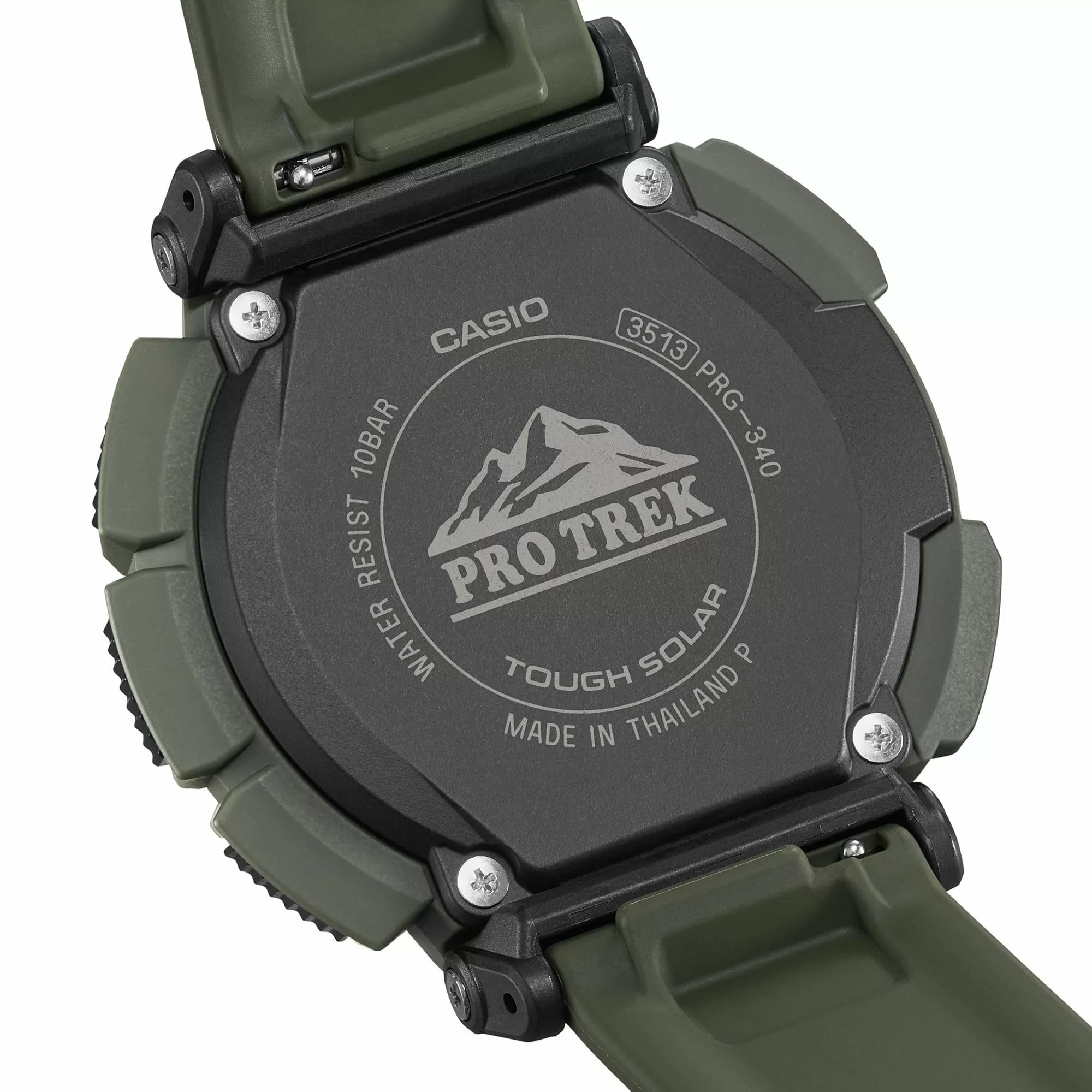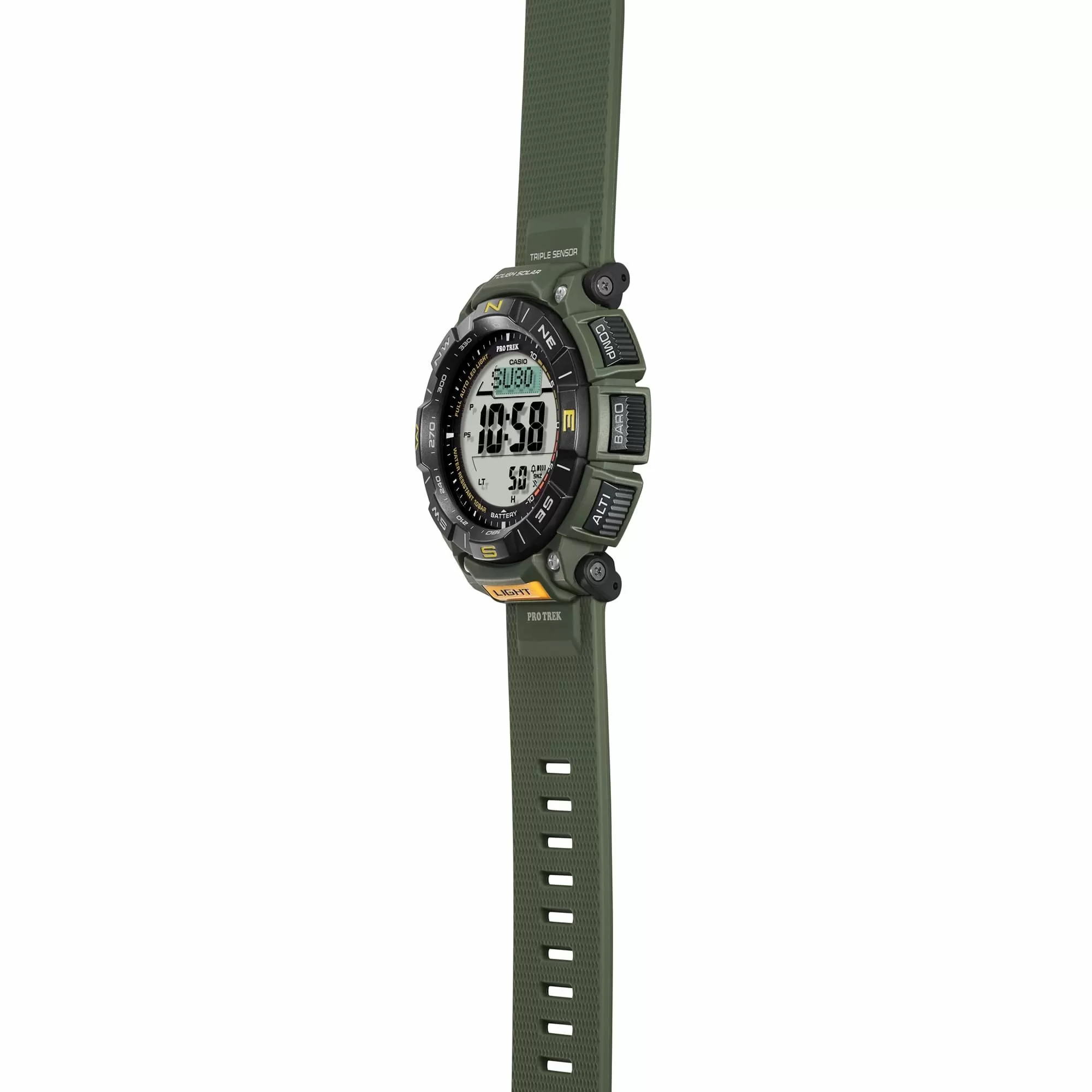 Casio PRG-340-1ER PROTREK PRG-340 1 w całkowicie zielonym kolorze, z czytelnym wyświetlaczem LCD w pozytywie i zaawansowanymi funkcjami outdoorowymi,  to nowoczesny zegarek sportowy, który świetnie nadaje się dla kobiet i mężczyzn, prowadzących aktywny tryb życia. Czasomierz Casio PRG-340-1ER utrzymany jest w ciemnej kolorystyce. Wytrzymałą kopertę i pasek wykonano z wysokiej jakości tworzywa sztucznego, które jest lekkie i wygodne w noszeniu. Sercem zegarka jest precyzyjny mechanizm kwarcowy, zasilany za pomocą energii słonecznej. Akumulatorek czasomierza ładowany jest przez wbudowane w tarczę ogniwa fotowoltaiczne. Dzięki temu nie ma konieczności wymiany baterii. O stanie energii informuje wskaźnik poziomu naładowania. Atrakcyjny elektroniczny cyferblat wyposażony został w automatyczne podświetlenie całej tarczy, co pozwala w szybki i wygodny sposób kontrolować czas w ciemności, poprzez podniesienie ręki do twarzy. Tarczę osłania - wytrzymałe na uszkodzenia i zarysowania - twarde szkiełko mineralne.