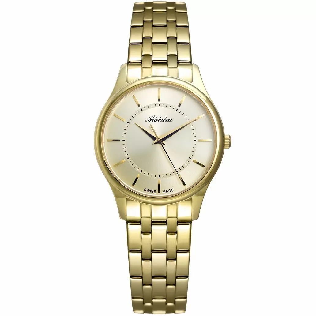 Zegarek damski Adriatica A3179.1111Q to wyjątkowo elegancki i ponadczasowy model z szafirowym szkiełkiem i połyskującymi polerowanymi indeksami i wskazówkami na złotej tarczy, zamkniętej w złotej obudowie, połączonej ze złotawą bransoletką. To elegancki produkt, wykonany z niezwykle ogromną dbałością o szczegóły. Jak wszystkie zegarki Adriatica, model A3179.1111Q został stworzony w oparciu o długoletnią historię zegarmistrzowską. Solidne, dokładne i niezawodne, takie właśnie muszą być zegarki damskie opatrzone logiem Swiss Made. Ten zegarek Adriatica, z linii A3179 działa na precyzyjnym mechanizmie kwarcowym, zasilanym za pomocą baterii, który charakteryzuje się wysoką dokładnością w pomiarze czasu - zakres tolerancji wynosi ok. +/- 15 sekund w przeciągu 30 dni.