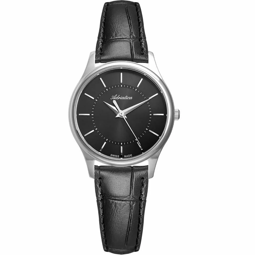 Zegarek damski Adriatica A3179.5216Q to wyjątkowo elegancki i ponadczasowy model z szafirowym szkiełkiem i połyskującymi polerowanymi srebrnymi indeksami i wskazówkami na czarnej tarczy, zamkniętej w srebrnej obudowie, połączonej z czarnym paskiem. To elegancki produkt, wykonany z niezwykle ogromną dbałością o szczegóły. Jak wszystkie zegarki Adriatica, model A3179.5216Q został stworzony w oparciu o długoletnią historię zegarmistrzowską. Solidne, dokładne i niezawodne, takie właśnie muszą być zegarki damskie opatrzone logiem Swiss Made. Ten zegarek Adriatica, z linii A3179 działa na precyzyjnym mechanizmie kwarcowym, zasilanym za pomocą baterii, który charakteryzuje się wysoką dokładnością w pomiarze czasu - zakres tolerancji wynosi ok. +/- 15 sekund w przeciągu 30 dni.