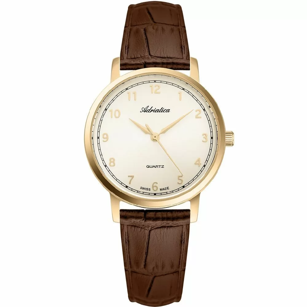 Zegarek damski Adriatica A3187.1221Q jest bardzo czytelny i ponadczasowy, gdyż posiada prostą złotawą tarczę z oznaczeniami w postaci arabskich cyfr, zamkniętą w okrągłej kopercie w złotym kolorze, sparowanej z paskiem ze skóry. To elegancki produkt, wykonany z niezwykle ogromną dbałością o szczegóły. Jak wszystkie zegarki Adriatica, model A3187.1221Q został stworzony w oparciu o długoletnią historię zegarmistrzowską. Solidne, dokładne i niezawodne, takie właśnie muszą być zegarki damskie opatrzone logiem Swiss Made. Ten zegarek Adriatica, z linii A3187 działa na precyzyjnym mechanizmie kwarcowym, zasilanym za pomocą baterii, który charakteryzuje się wysoką dokładnością w pomiarze czasu - zakres tolerancji wynosi ok. +/- 15 sekund w przeciągu 30 dni.
