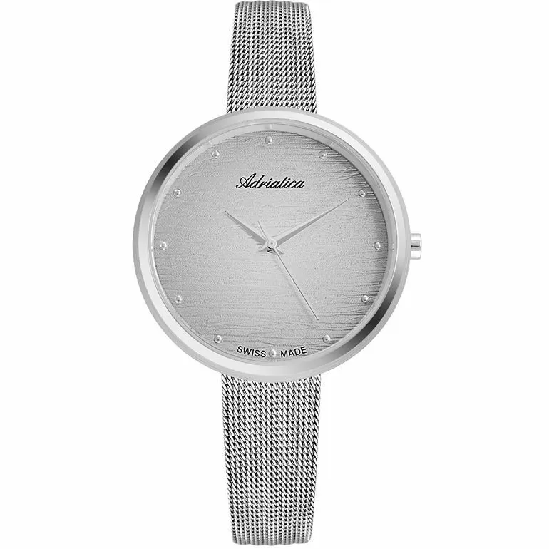 Zegarek damski Adriatica A3716.5147Q o pięknej szarej, szczotkowanej tarczy, to elegancki produkt, wykonany z niezwykle ogromną dbałością o szczegóły. Jak wszystkie zegarki Adriatica, model A3716.5147Q został stworzony w oparciu o długoletnią historię zegarmistrzowską. Solidne, dokładne i niezawodne, takie właśnie muszą być zegarki damskie opatrzone logiem Swiss Made. Ten zegarek Adriatica, z linii A3716 działa na precyzyjnym mechanizmie kwarcowym, zasilanym za pomocą baterii, który charakteryzuje się wysoką dokładnością w pomiarze czasu - zakres tolerancji wynosi ok. +/- 15 sekund w przeciągu 30 dni. Koperta, o szerokości 35.00 mm, jaką posiada zegarek Adriatica A3716.5147Q wykonana została z antyalergicznej, odpornej na korozję, wysokiej jakości stali szlachetnej i ma kolor srebrny. Jej kształt jest Okrągły i idealnie komponuje się z dopasowaną bransoletą typu mesh, której materiał wykonania - stal szlachetna o wysokiej odporności - gwarantuje komfortowe użytkowanie. Tarcza w tym modelu ma kolor szary, a pełne godziny zostały oznakowane przez Indeksy, dzięki czemu zegarek Adriatica A3716.5147Q jest czytelny. Tarczę tego czasomierza chroni szkło mineralne, odporne na delikatne przerysowania. Ten zegarek szwajcarski posiada wodoszczelność 3ATM - jest odporny na zachlapania np. deszcz czy mycie rąk. Styl modeli z linii Adriatica A37163 można określić jako biżuteryjny, a ponadczasowy design sprawia, że są to idealne zegarki dla kobiet w każdym wieku. Zegarek damski Adriatica A3716.5147Q to wyprodukowany na bazie szwajcarskich technologii czasomierz, łączący w sobie gustowne wykonanie z najwyższą jakością.