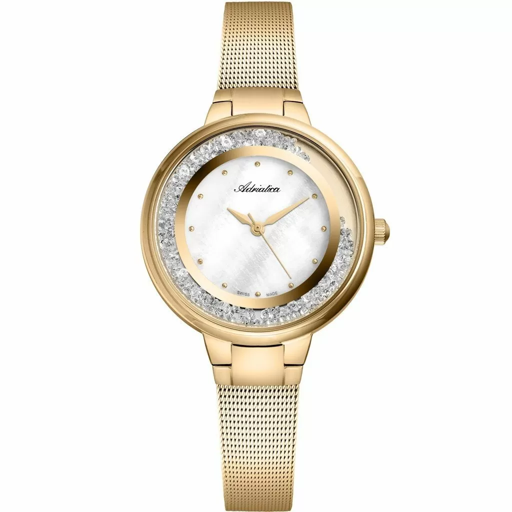 Zegarek Adriatica A3720.114FQZ damski szwajcarski zegarek z kryształami i perłową tarczą w złotej obudowie