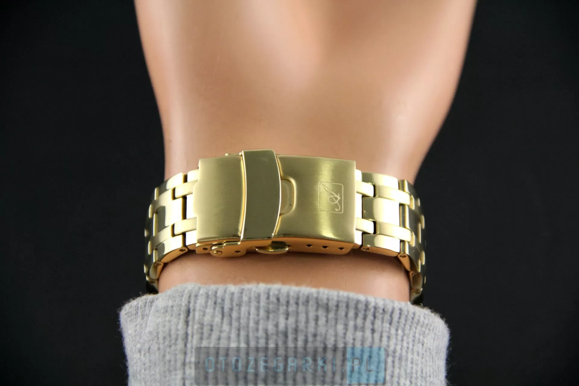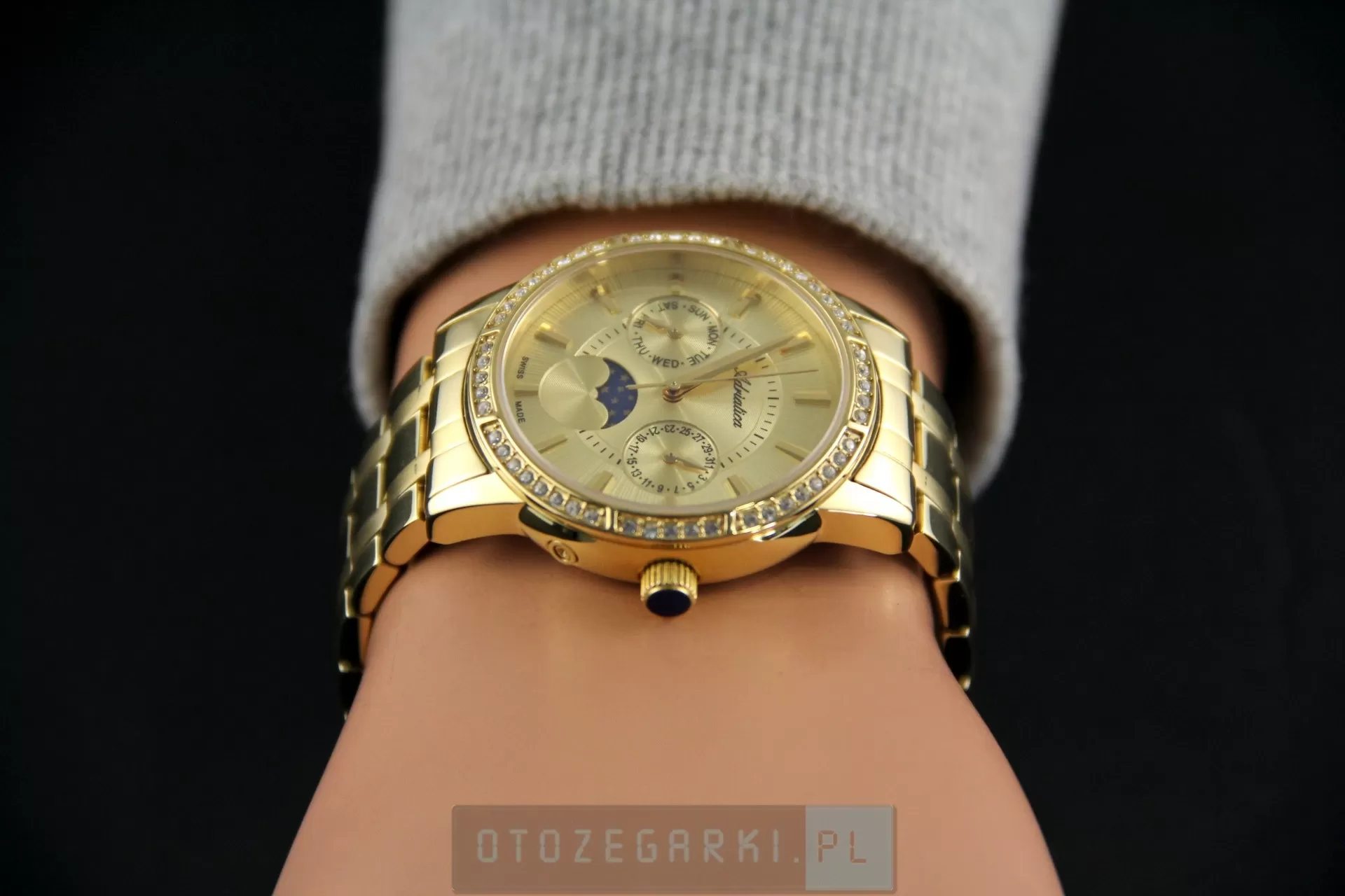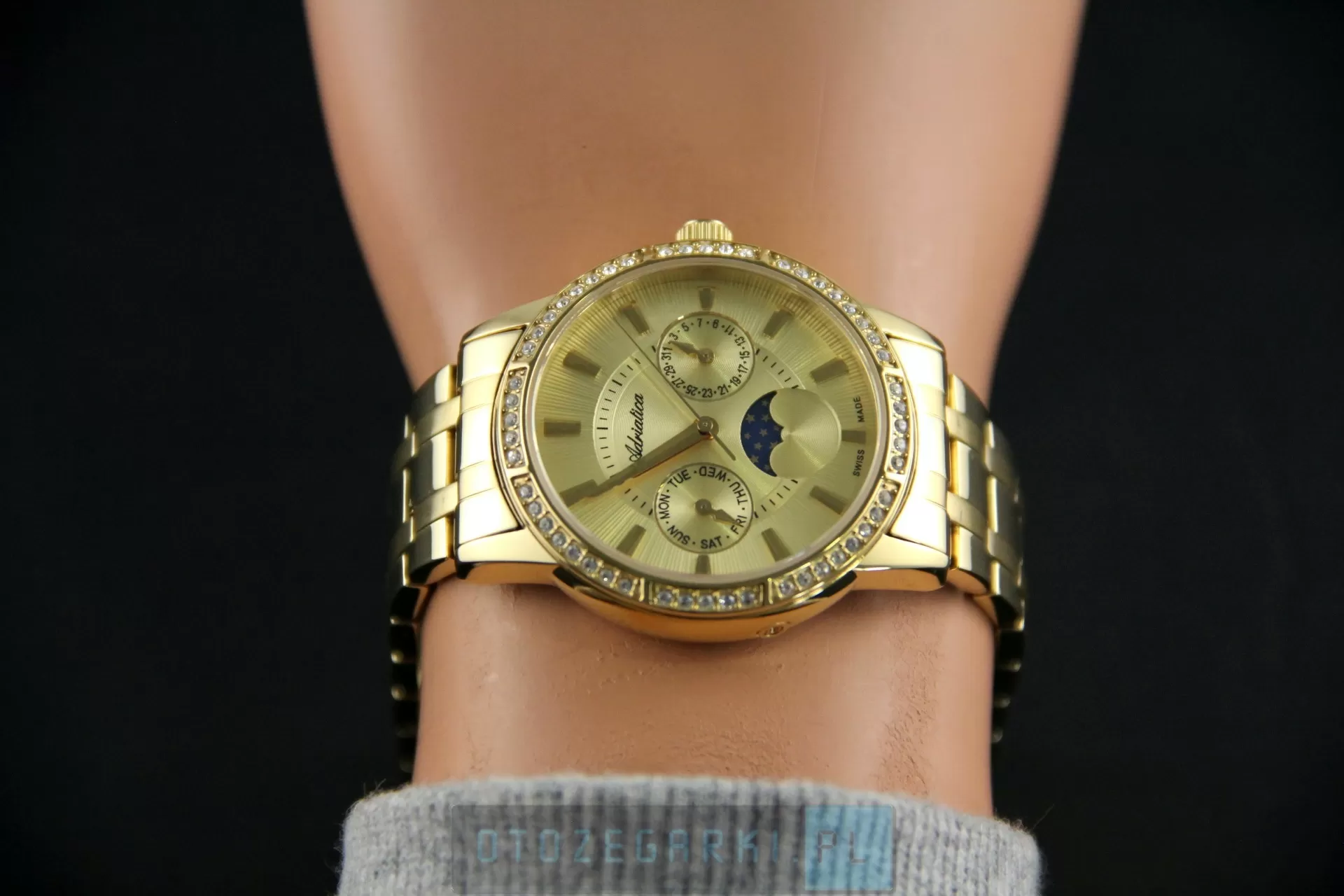 Zegarek damski Adriatica A3601.1111QFZ to elegancki produkt, wykonany z niezwykle ogromną dbałością o szczegóły. Jak wszystkie zegarki Adriatica, model A3601.1111QFZ został stworzony w oparciu o długoletnią historię zegarmistrzowską. Solidne, dokładne i niezawodne, takie właśnie muszą być zegarki damskie opatrzone logiem Swiss Made. Ten zegarek Adriatica, z linii A3601 działa na precyzyjnym mechanizmie kwarcowym, zasilanym za pomocą baterii, który charakteryzuje się wysoką dokładnością w pomiarze czasu - zakres tolerancji wynosi ok. +/- 15 sekund w przeciągu 30 dni. Koperta, o szerokości 34.00 mm, jaką posiada zegarek Adriatica A3601.1111QFZ wykonana została z antyalergicznej, odpornej na korozję, wysokiej jakości stali szlachetnej, wykończonej pięknie mieniącymi się w świetle kryształami i ma kolor Złoty. Jej kształt jest Okrągły i idealnie komponuje się z dopasowaną bransoletą, której materiał wykonania - stal szlachetna o wysokiej odporności - gwarantuje komfortowe użytkowanie. Tarcza w tym modelu ma kolor złoty, a pełne godziny zostały oznakowane przez Indeksy, dzięki czemu zegarek Adriatica A3601.1111QFZ jest czytelny. Tarczę tego czasomierza chroni szkło szafirowe, które charakteryzuje wysoka odporność na zarysowania . Ten zegarek szwajcarski posiada wodoszczelność pozwalającą na kąpiel, a nawet pływanie powierzchniowe – 5ATM oraz funkcje takie jak multidatownik, czyli rozbudowany datownik i wskazanie faz księżyca. Styl modeli z linii Adriatica A3601 można określić jako fashion, a ponadczasowy design sprawia, że są to idealne zegarki dla kobiet w każdym wieku. Zegarek damski Adriatica A3601.1111QFZ to wyprodukowany na bazie szwajcarskich technologii czasomierz, łączący w sobie gustowne wykonanie z najwyższą jakością.