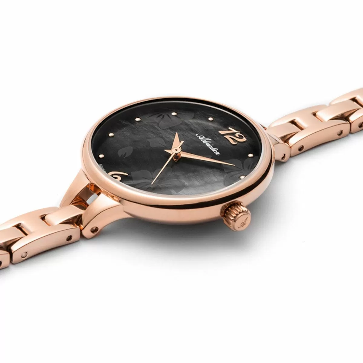 Zegarek damski Adriatica A3761.917MQ to niezwykle kobiecy model szwajcarskiej produkcji, którego podstawę stanowi koperta ze stali szlachetnej w kolorze różowozłotym, połączona z bransoletą, kryjąca perłowoczarną tarczę z indeksami i cyframi arabskimi na pełnych godzinach. Jak wszystkie zegarki Adriatica, model A3761.917MQ został stworzony w oparciu o długoletnią historię zegarmistrzowską. Solidne, dokładne i niezawodne, takie właśnie muszą być zegarki damskie opatrzone logiem Swiss Made.