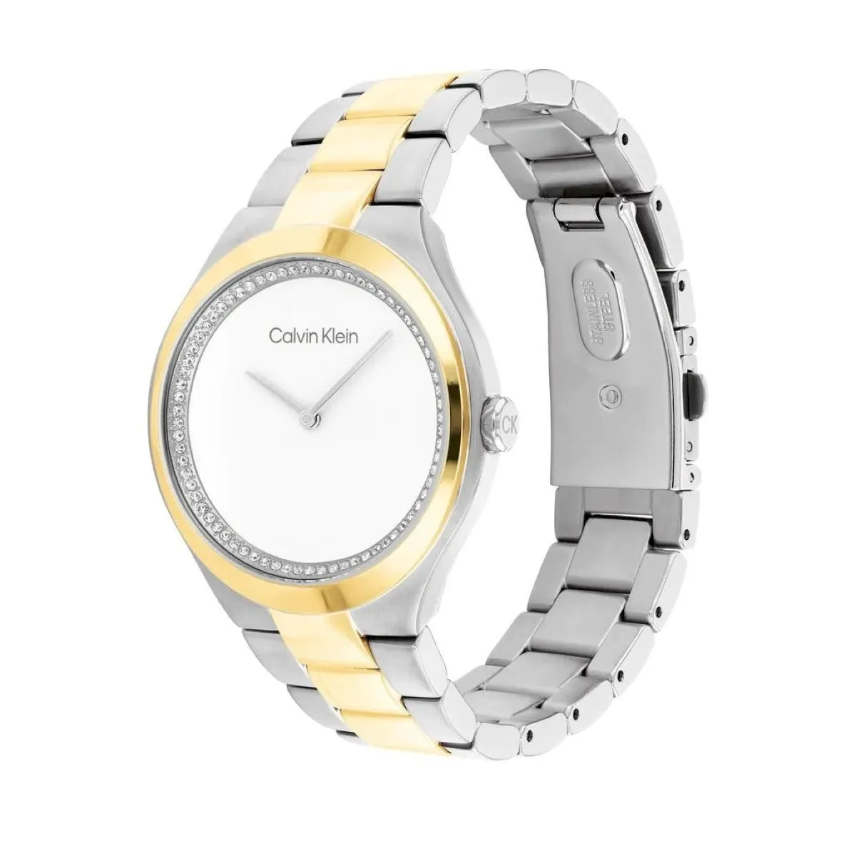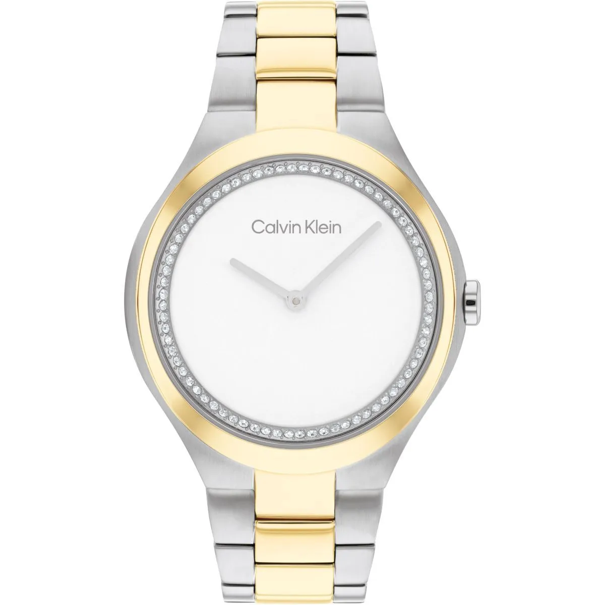 Zegarek damski Calvin Klein z kolekcji 25200366 Admire z obudową kolorze złoto-srebrnym, białą tarczą i złoto-srebrną bransoletką typu mesh: