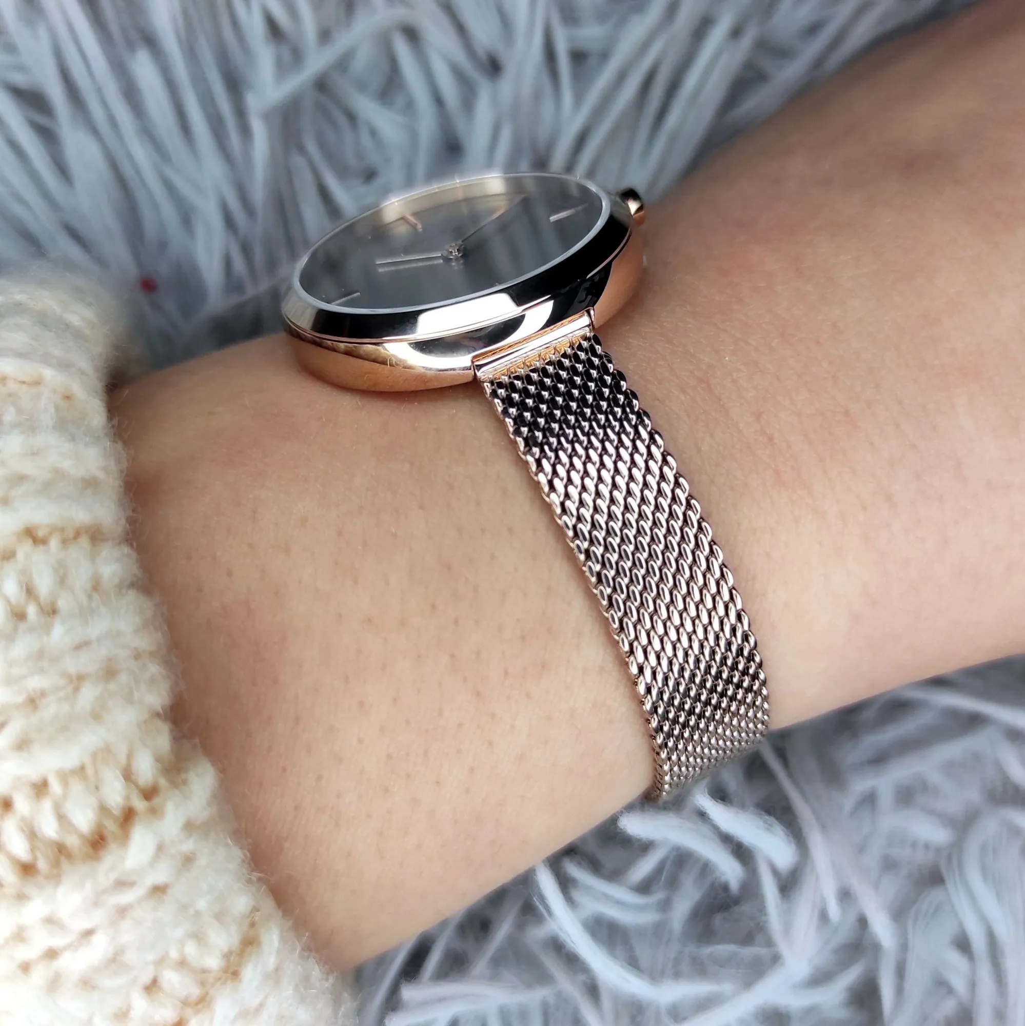 - różowozłota bransoletka typu mesh,