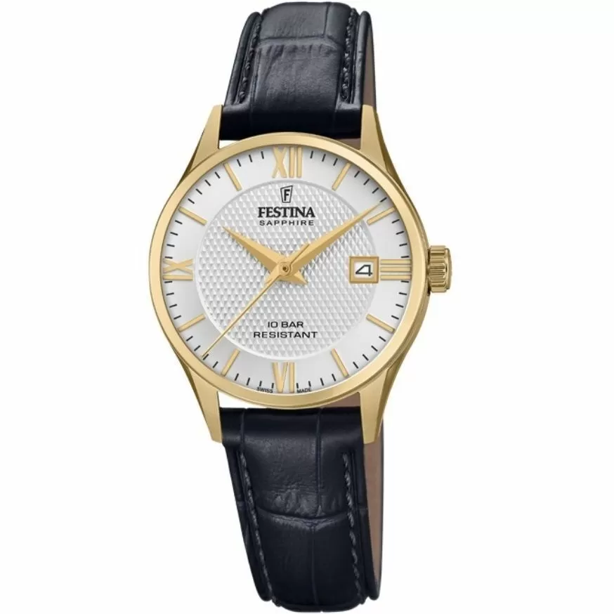 Zegarek Damski Festina 20011/1 SWISS MADE F20011 1 model ze szwajcarskim mechanizmem Ronda i szafirowym szkiełkiem, o złotej okrągłej kopercie, czarnym pasku skórzanym i srebrnej tarczy, z oznaczeniami pełnych godzin w postaci indeksów i cyfr rzymskich o złoconym wykończeniu. Atrakcyjna cena za tej klasy model jest jego dodatkowym atutem!