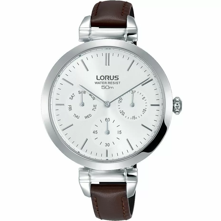 Zegarek damski Lorus RP611DX8 to stylowy model działający na mechanizmie kwarcowym, zasilanym przez baterię, który charakteryzuje się niskim odchyleniem w pomiarze czasu (zaledwie +/- 10 sekund w skali miesiąca). Został on ukryty pod elegancką tarczą w białym odcieniu, na której pełne godziny zostały oznakowane przez  indeksy, poprawiające czytelność już na pierwszy rzut oka. Całość chroni odporne na delikatne przerysowania szkiełko mineralne, zamykające okrągłą kopertę o szerokości 36 mm. Obudowa ma grubość 9 mm, co zapewnia komfortowe użytkowanie w każdej sytuacji i została zaprojektowana tak, aby zapewnić 5 ATM wodoszczelności, znakomicie sprawdzające się w codziennym użytkowaniu. Rewelacyjnie prezentuje się połączenie koperty w srebrnym kolorze z brązowym skórzanym paskiem. Zegarek RP611DX8 prócz wskazania godziny oferuje także rozbudowane wskazanie datownika - w dodatkowych tarczach znajduje się oznaczenie dnia miesiąca i dnia tygodnia.