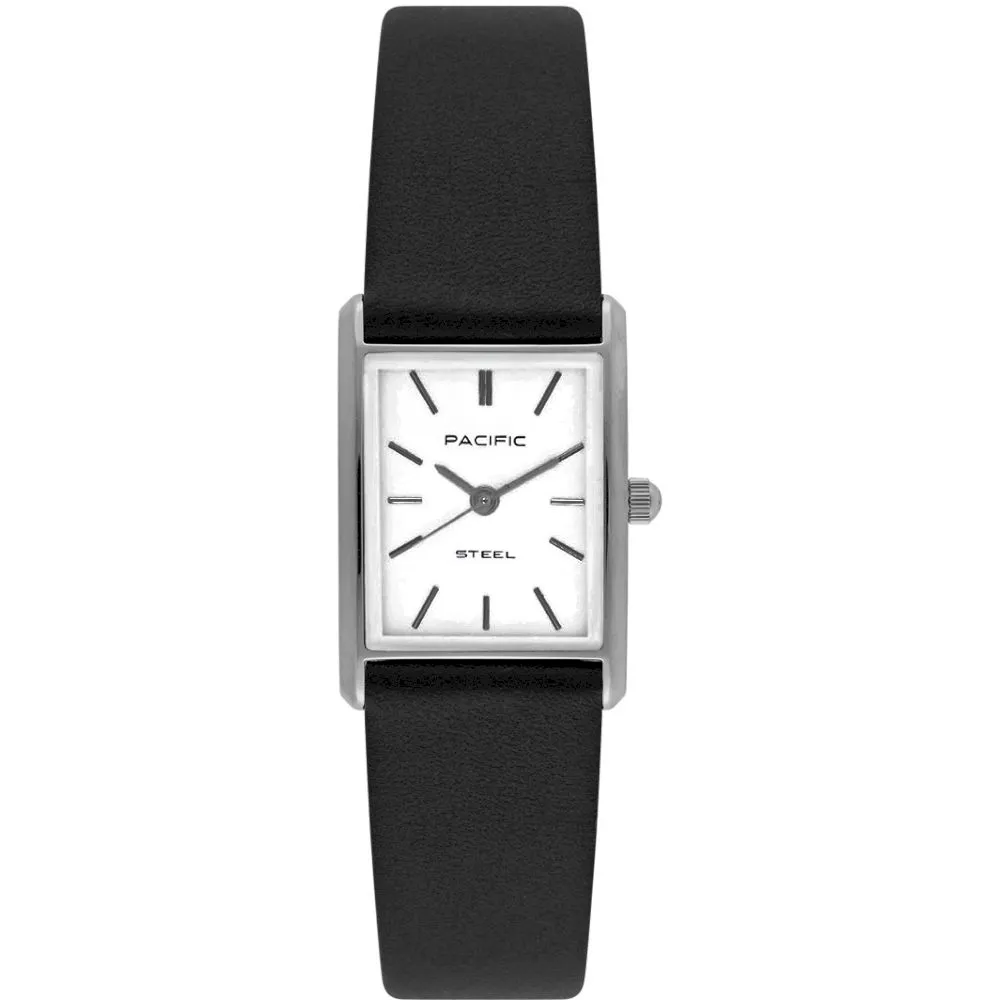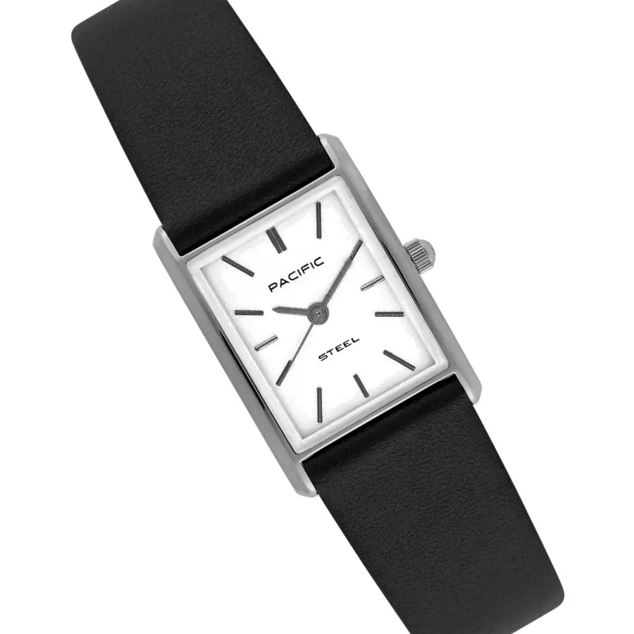 Zegarek damski Pacific srebrna prostokątna koperta, czarny pasek, biała tarcza i indeksy - SLA-1604 klasyczna elegancja w ponadczasowej formie