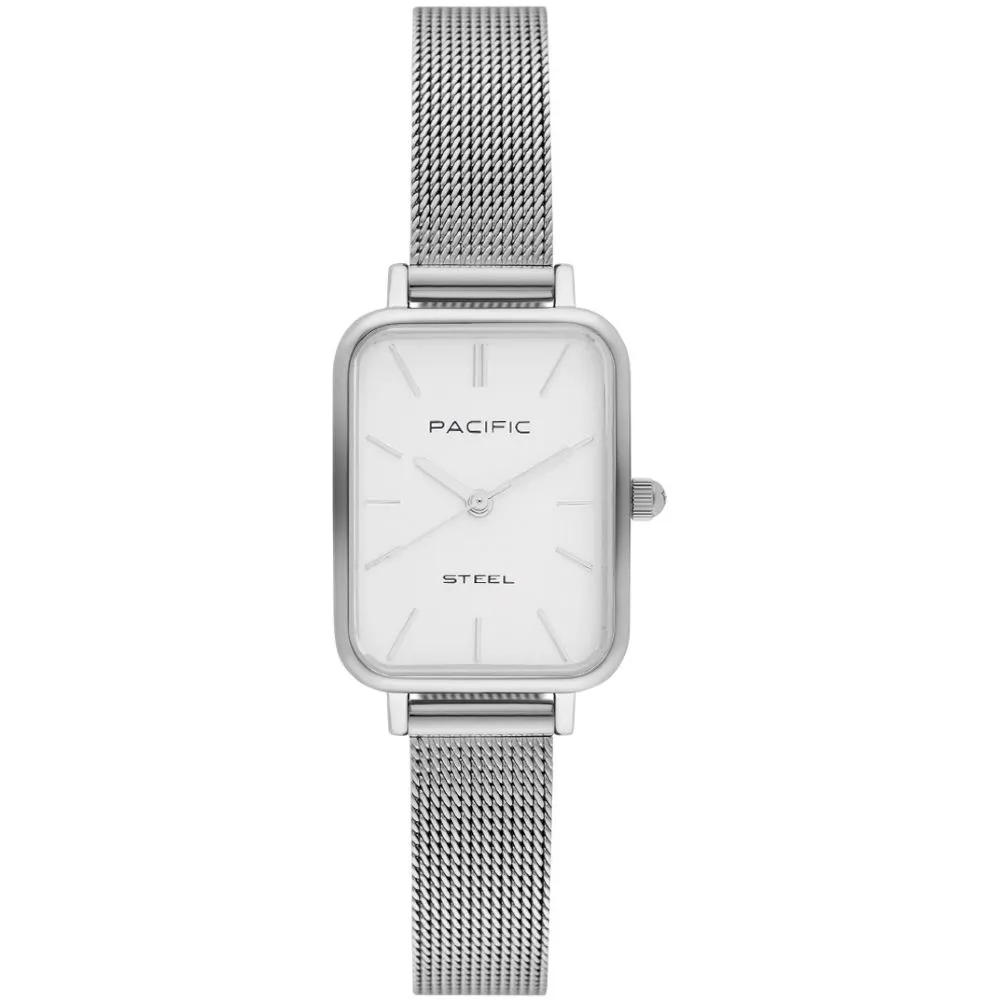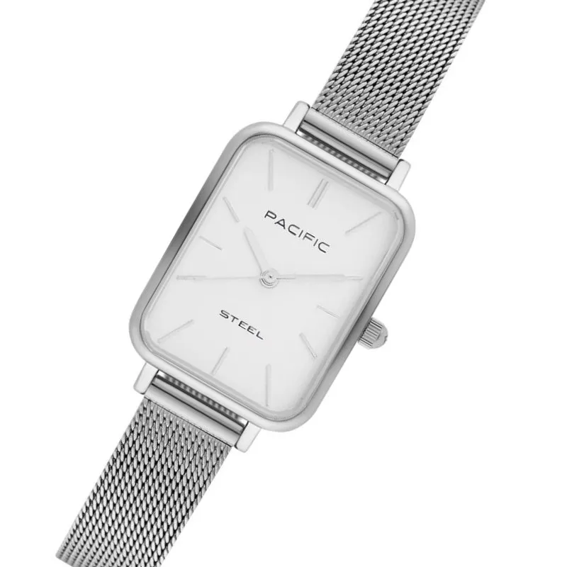 Zegarek damski Pacific srebrna prostokątna koperta, srebrna siateczkowa bransoletka, biała tarcza i indeksy - SLC-1602 klasyczna elegancja w ponadczasowej formie